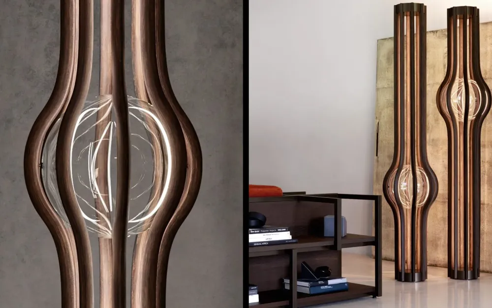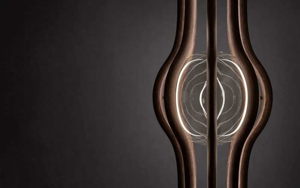 Cattura la scena la lampada Ashaa, un incontro inaspettato tra poesia e scultura, fatto di legno, vetro e luce. Otto esili doghe curvate, finitura Rovere Caffè, inglobano e sorreggono una sfera in vetro soffiato (in 3 versioni: Trasparente, Fumé, Bronzo) posizionabile a piacere nella parte superiore o inferiore della lampada.
