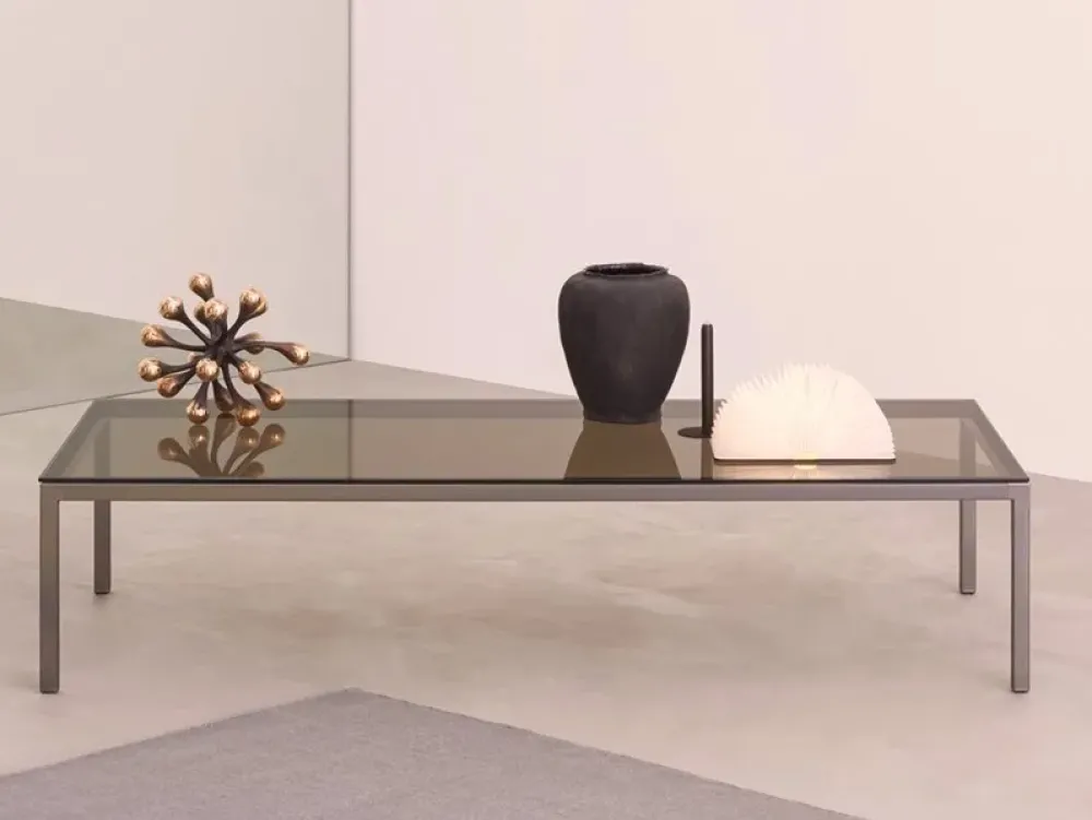 Il tavolino presenta una struttura solida in acciaio laccato e piano in cristallo temperato color BRONZO di spessore 8 mm. In outlet viene proposto nella versione L:140 x P:52 x H:40.