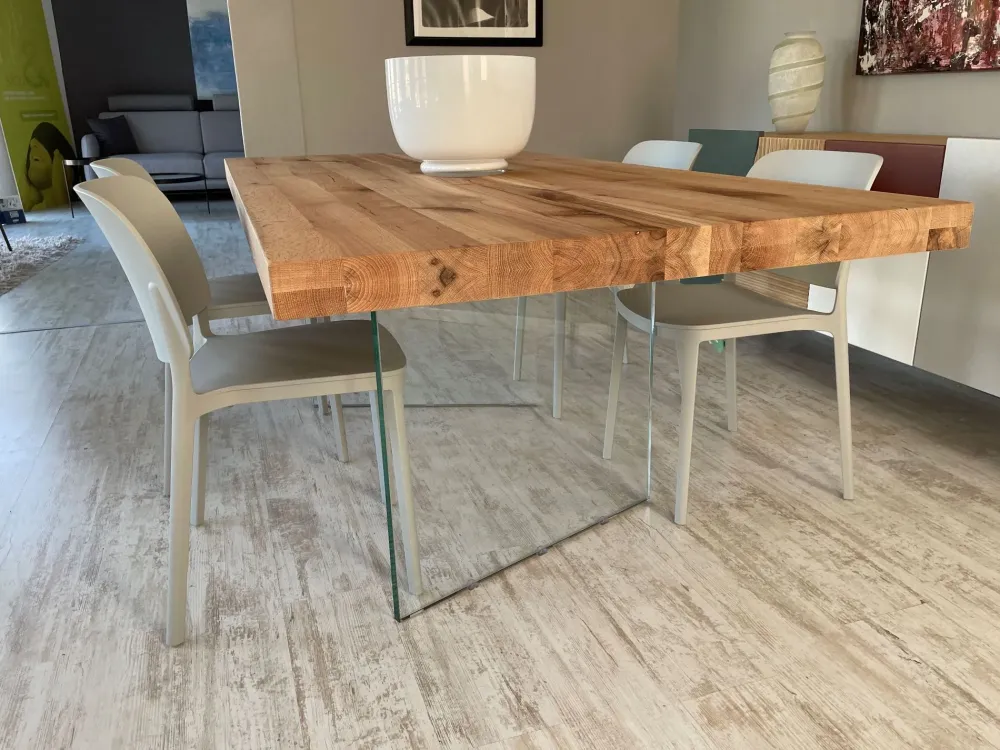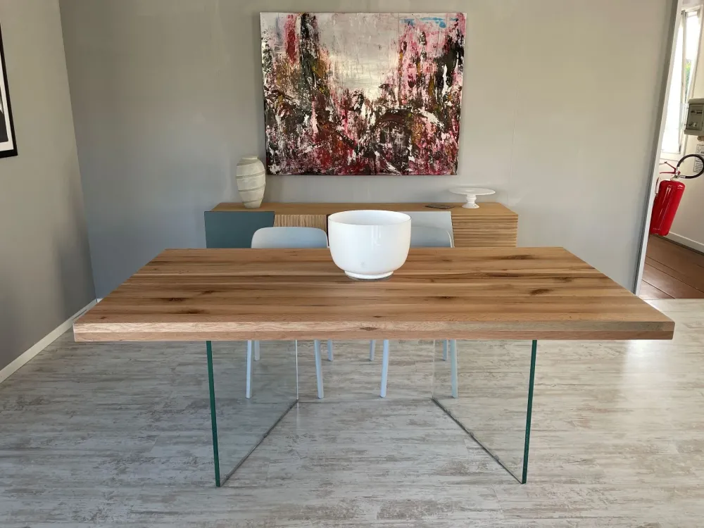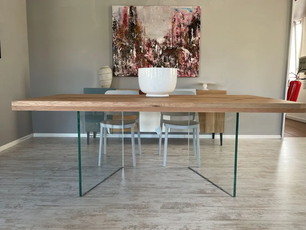 Tavolo Devina Nais in legno con bordi dritti nelle dimensioni L 200 x P 100 cm effetto grezzo predisposto per gambe WALL in vetro per tavolo posizionate a “V”.
