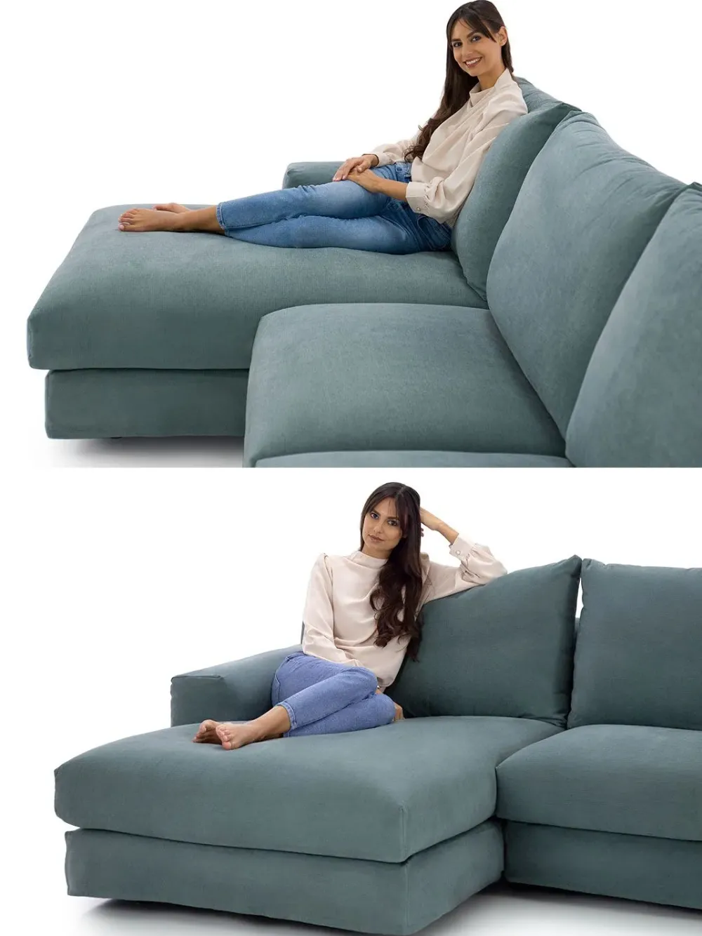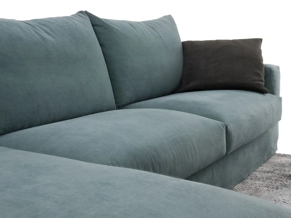 Lo stile è contemporaneo, con volumi pieni e generosi: i cuscini di seduta sono abbondanti, imbottiti con espanso e fibra effetto piuma, mentre quelli di schienale sono imbottiti con vera piuma, offrendo morbidezza e comfort. I piedini bassi sono nascosti dalla gonna della fodera, che non è fissata alla struttura del divano, facilitando così la sfoderabilità.