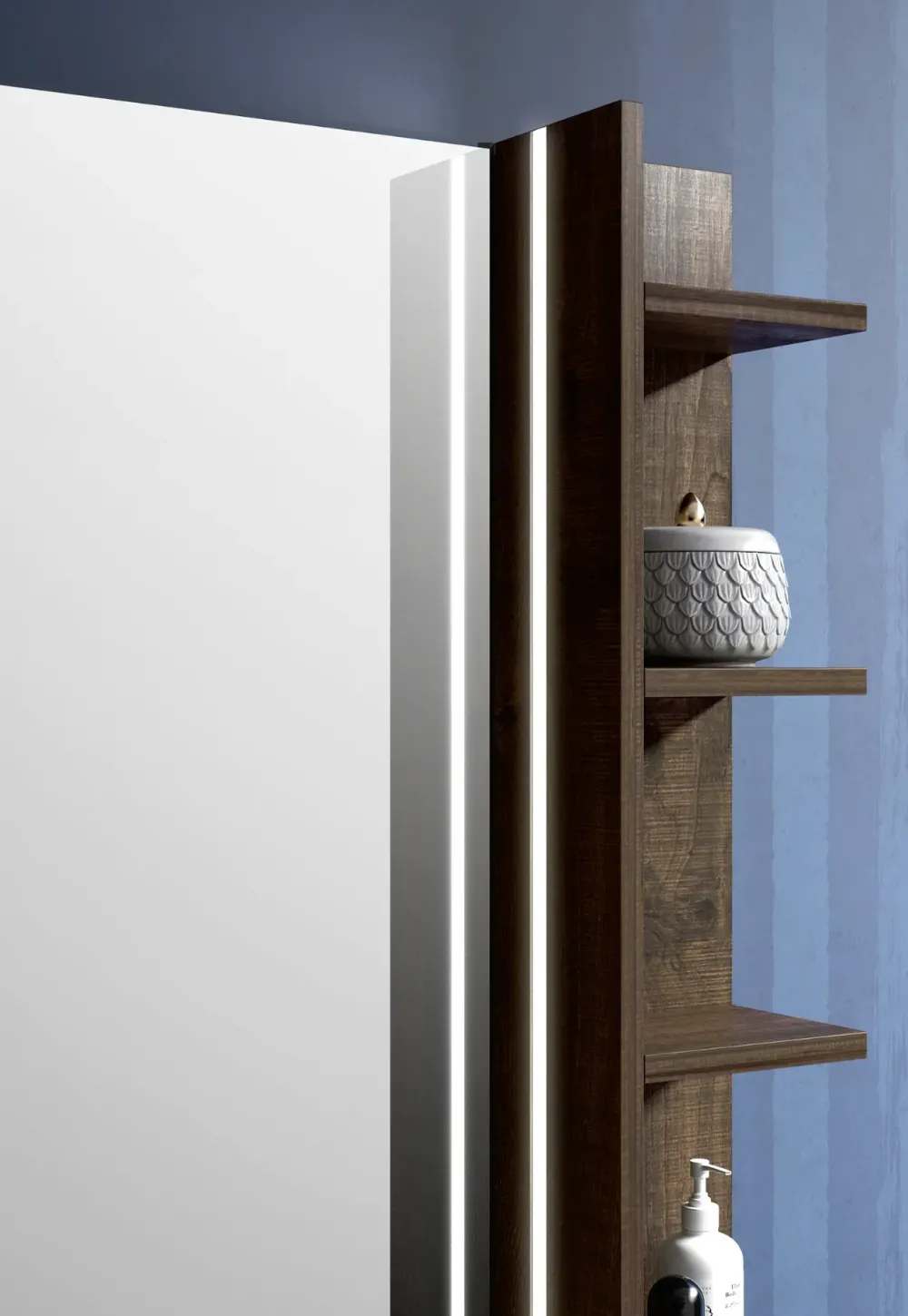 Si aggiunge spazio disponibile grazie ai ripiani dell’elemento pensile a giorno L20x h.96 cm. mod.Flyn con luce a Led incorporata, realizzato in finitura Frassino Moro e abbinato allo specchio mod.Giò L.60 x h.96cm.