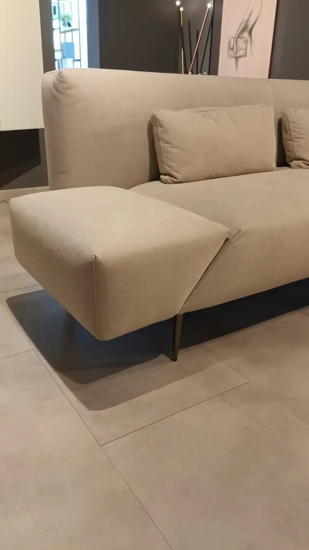 Divano composto con penisola e bracciolo trasformabile. Rivestimento in tessuto sfoderabile. Misure : L 274 x 168 cm.