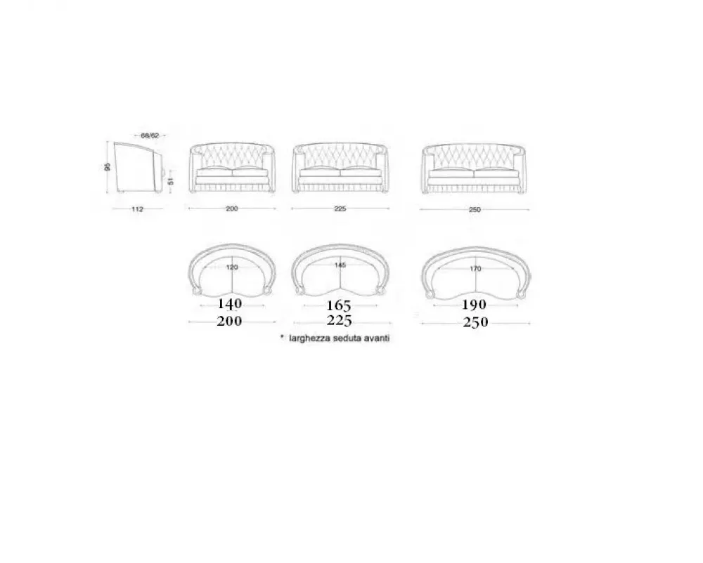 - I mobili sono da scegliere attentamente non solo per quanto riguarda le finiture con cui sono stati costruiti, ma pure per quanto riguarda le misure e lo spazio che occupano nei locali domestici: il modello qui visibile fa parte della fascia di imbottiti che vanno da 201 a 225 cm.