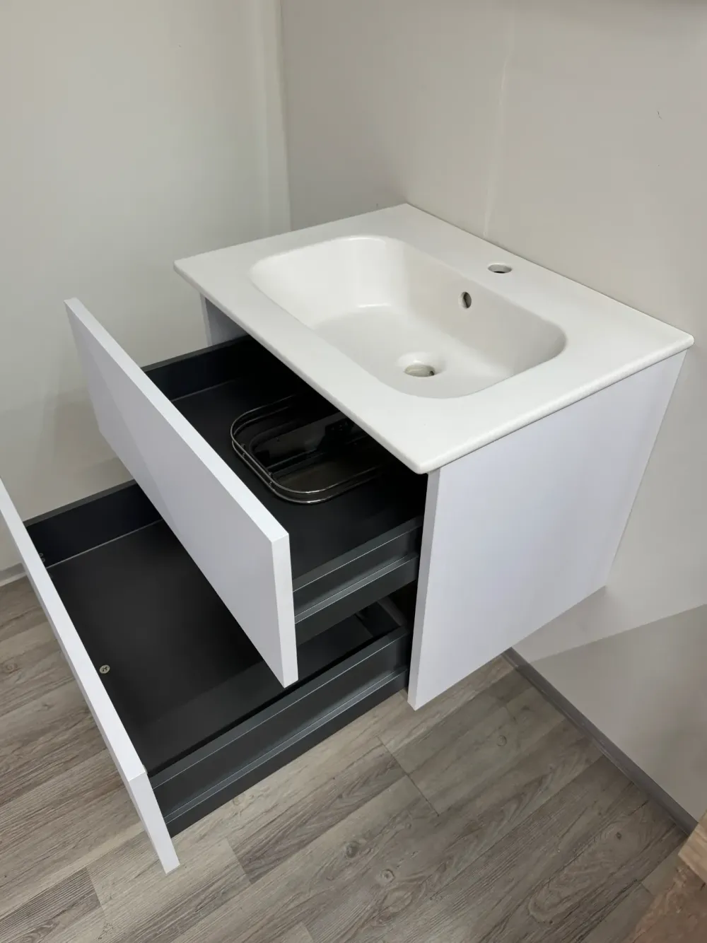 Mobile modello Byte Next01 con 2 cassetti in finitura color Bianco Ghiaccio, con chiusura rallentata e maniglia in alluminio (in foto: ancora da applicare)