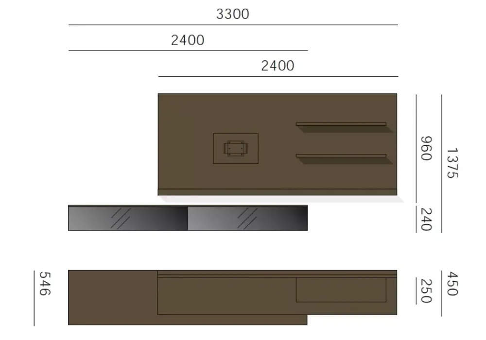 Misure: la base misura cm 240 di larghezza, profondità cm 54,6 ed altezza cm 25,5 . Il pannello TV misura cm 240 di larghezza , profondità cm – I due elementi sovrapposti raggiungono la lunghezza totale di cm 320-