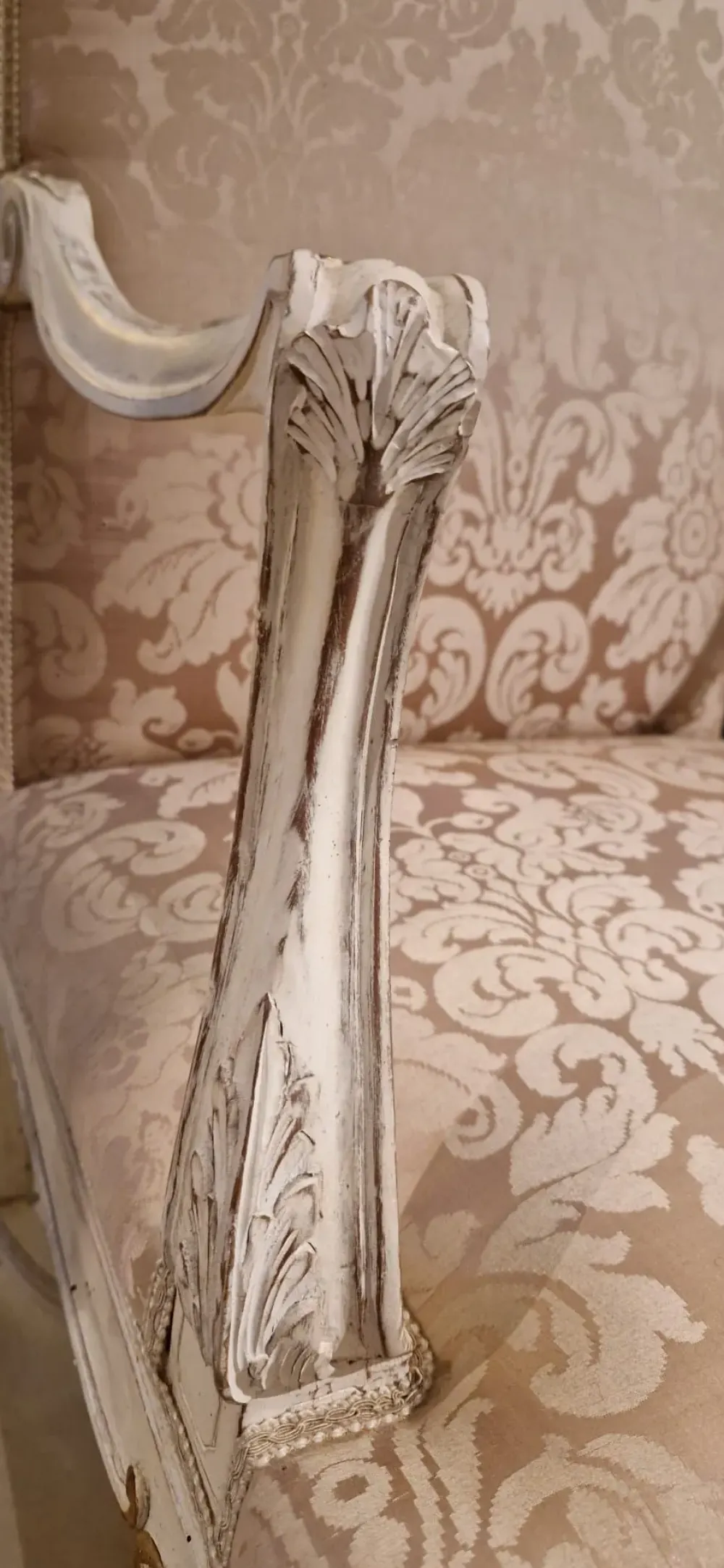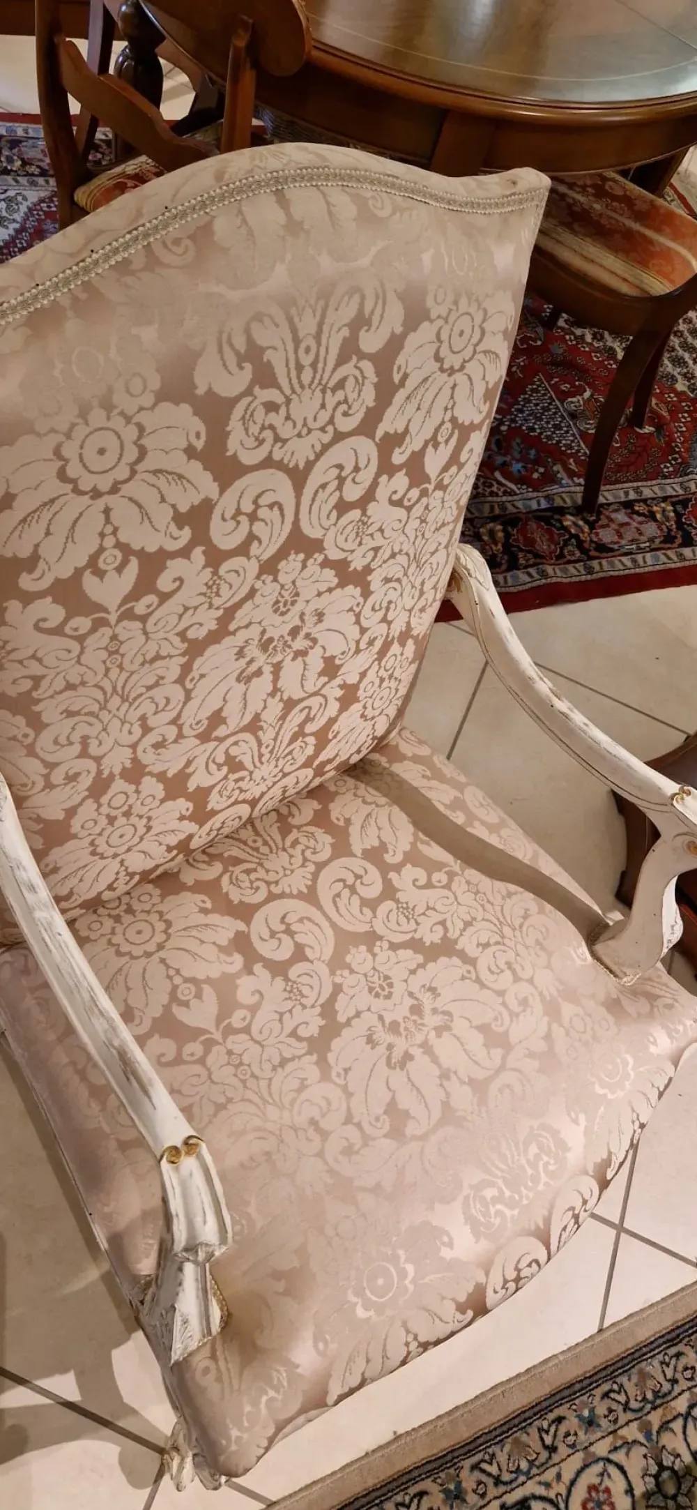 Stupenda poltroncina in stile scontata del 71 % Poltrona singola in stile Luigi XV con struttura in legno massello intagliato con decori floreali laccato bianco e oro; con schienale e seduta rivestiti in seta pura con motivo damascato di dimensioni L. 88 x p. 85 centimetri. Il legno di noce, gli elementi naturali degli intagli e le delicate incisioni si fondono e creano elementi caratteristici dello stile Luigi XV unito ai richiami della cultura e della manifatturiera italiana. L’Eccellenza dei prodotti artigianali italiani è la qualità. Essa accompagna da sempre i suoi progettisti ed artigiani che vivono con passione ogni momento delle loro creazioni ponendo particolare cura al dettaglio, agli effetti più ricercati, al gioco delle proporzioni e a quello degli effetti cromatici. Una qualità che scaturisce dalla artigianalità, sinonimo di variazione, che garantisce l’assenza di ogni serialità proprio perché create a mano. Possibilità di acquistarla singolarmente o in coppia. Consegna esclusa, consegniamo in tutta Italia tramite trasportatore specializzato in arredo.