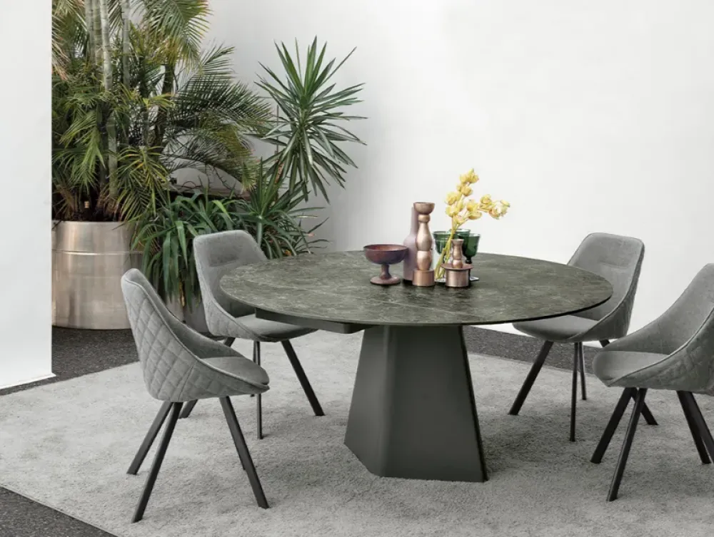 Tavolo con piano a botticella che diventa rotondo, passando da 6 a 8 posti.