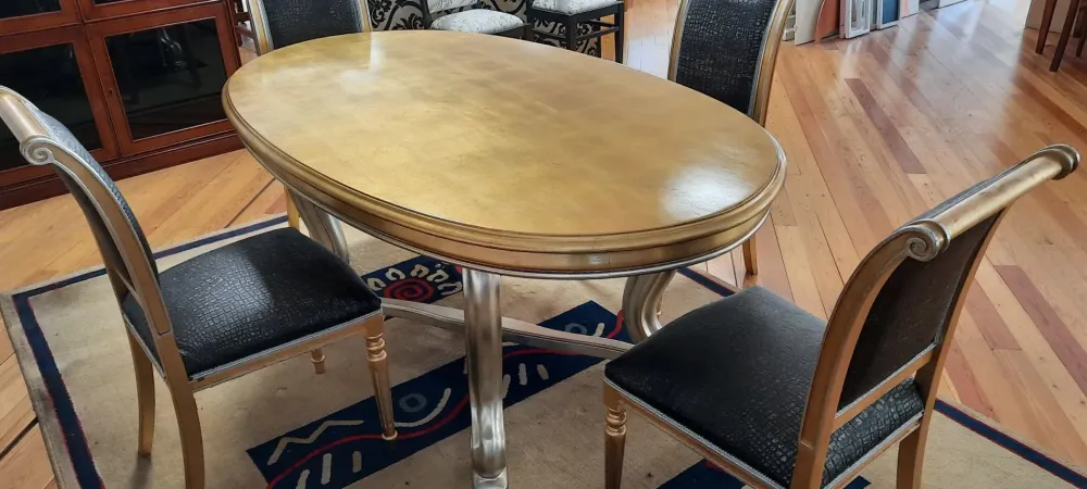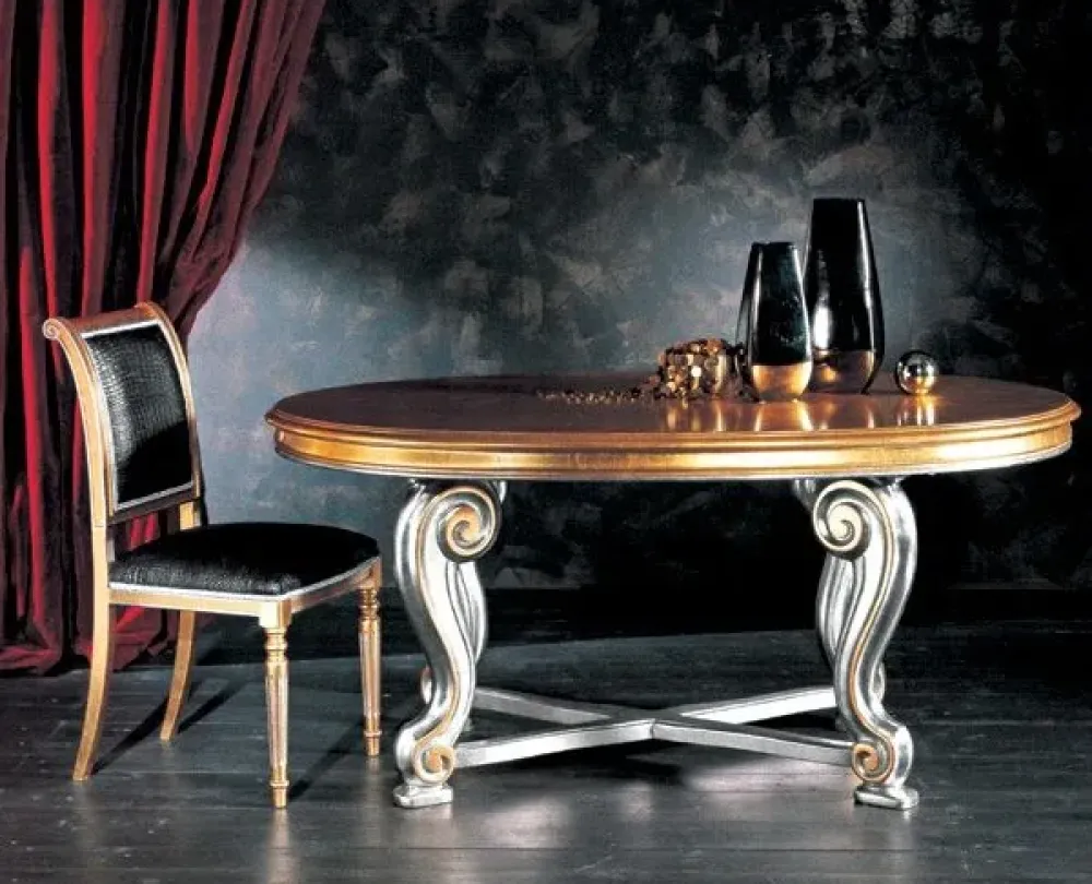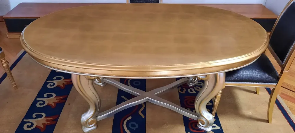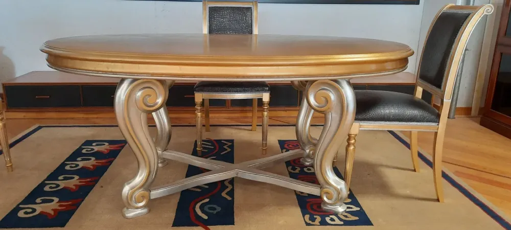 Tavolo Ovale massiccio con gambone intagliato a mano , finitura foglia oro e foglia argento , articolo realizzato interamente a mano ,pezzo unico.
