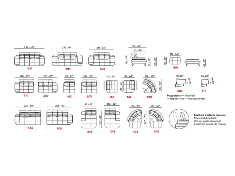 Salotto angolare composto da un divano ad un bracciolo ed angolo terminale, molto caratterizzanti sono le spalliere con meccanismo avanti – dietro manuale che aumentano la profondità del salotto di 26 cm.