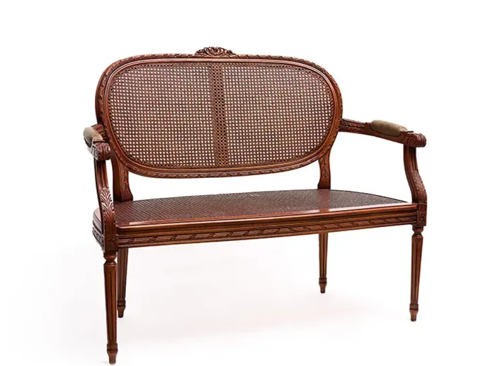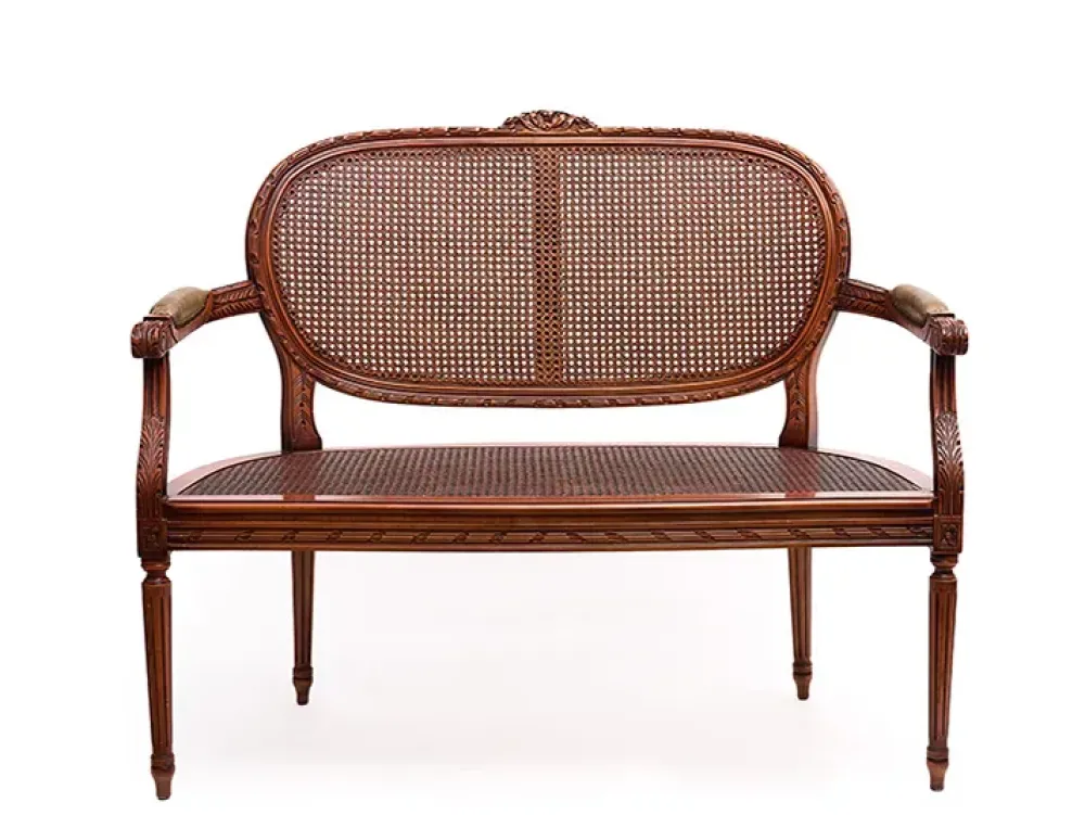 - Divanetto classico con struttura in legno, seduta e schienali impagliati, e braccioli rivestiti in pelle