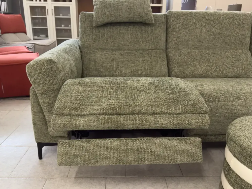 La prima poltrona a sx è dotata di movimento relax elettrico che fuoriesce per permettere di allungare le gambe e contemporaneamente lo schienale si abbassa per il massimo confort e per suggerire una comoda posizione di riposo.