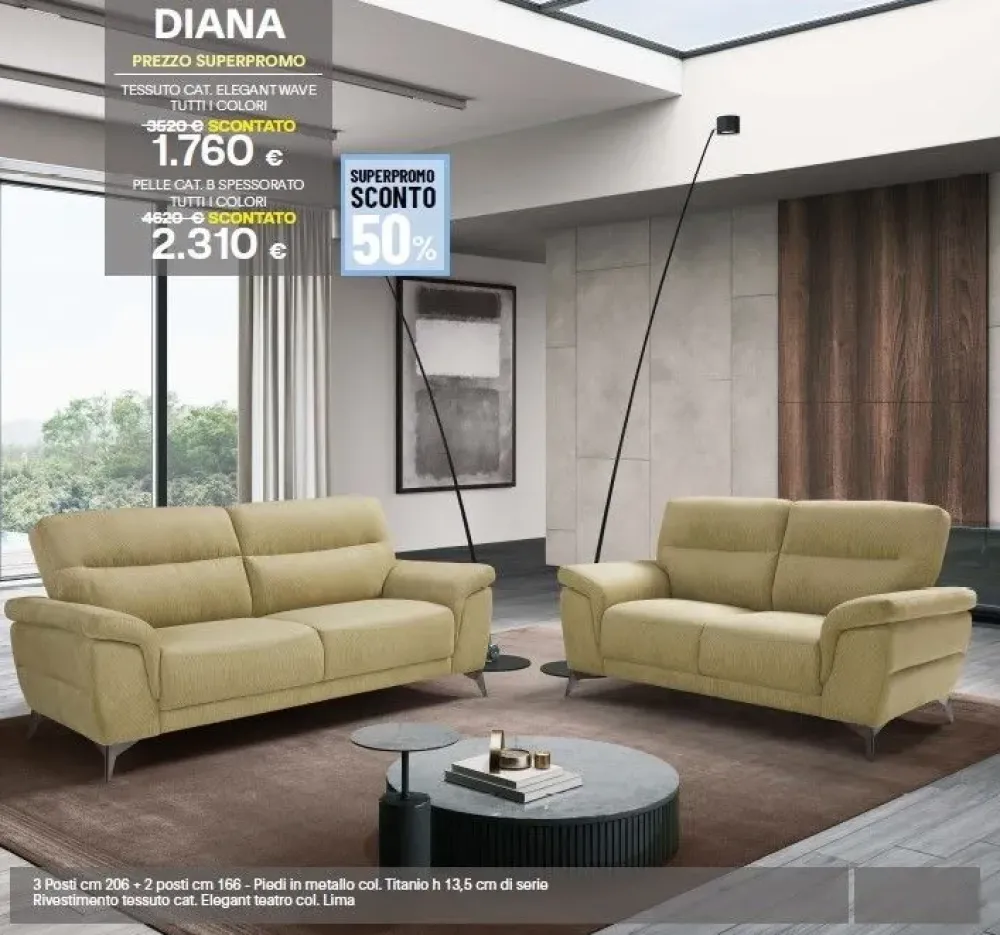 Che tu preferisca goderti momenti di relax nel tuo soggiorno, piuttosto che invitare spesso familiari e amici, si rivelerà imprescindibile disporre del giusto numero di sedute: tra gli imbottiti che ribassiamo, il modello Diana qui disponibile è un 2 posti; avrai a disposizione tutto lo spazio di cui hai bisogno grazie a questa soluzione, nonchè assicurerai ai tuoi familiari e amici una confortevole e accogliente permanenza.