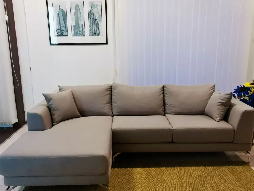 Divano in tessuto 2 posti + chaise longue. Dimensioni (in cm): L.262 P. 164 h.88. Struttura in legno. Piedini in acciaio.