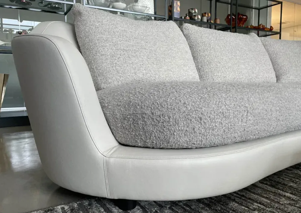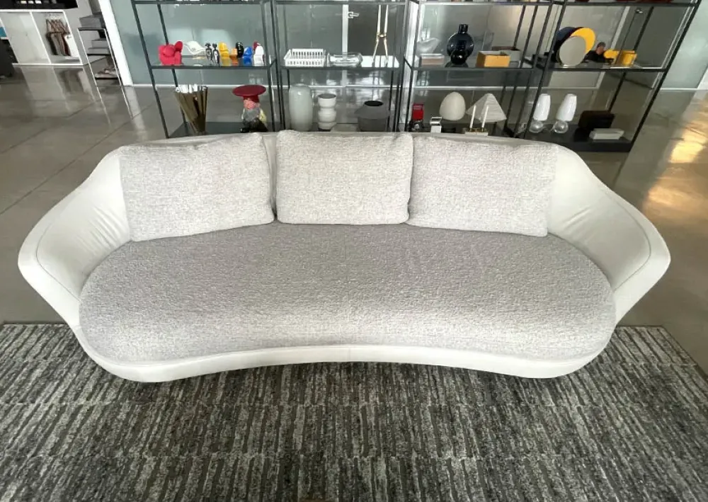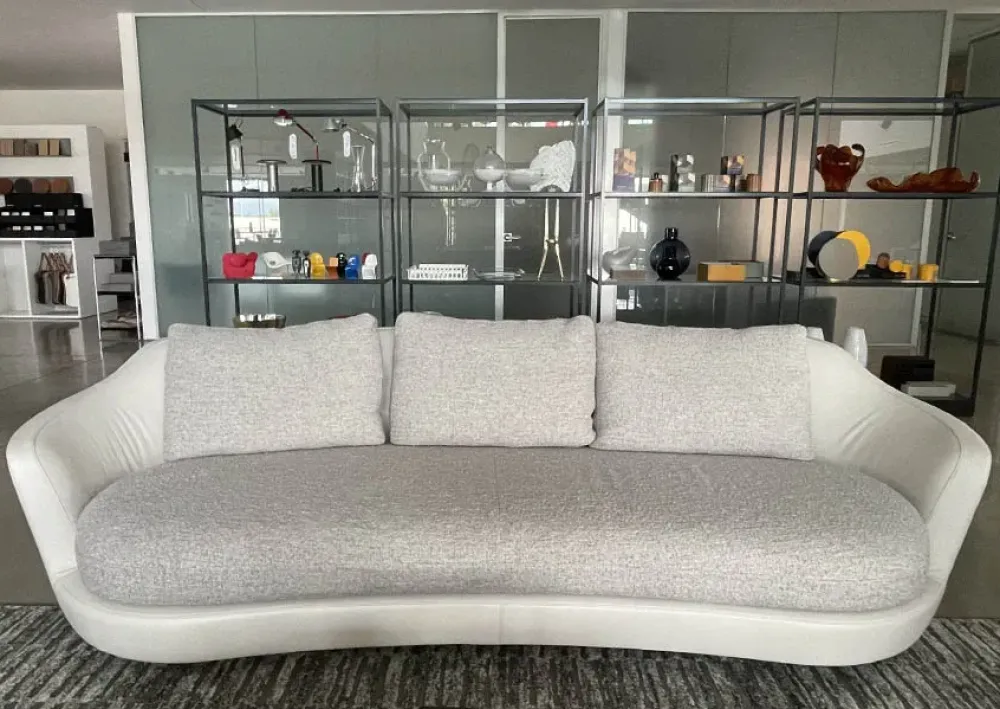 Divano Poltrona Frau mod. Duo Sofa, struttura esterna rivestita in pelle SC 19 Georgette, rivestimento cuscini in tessuto Haruka. Configurazione con tre cuscini schienale. Prodotto nuovo da esposizione. Dim: l.280 p.117 h.43/80