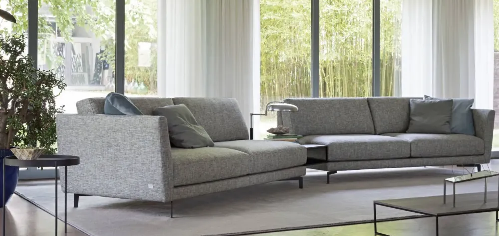 - Divano componibile con possibilità di integrazione di tavolini rettangolari o sagomati in metallo con piano in rovere cenere o canaletto, per creare movimento tra gli elementi della composizione.