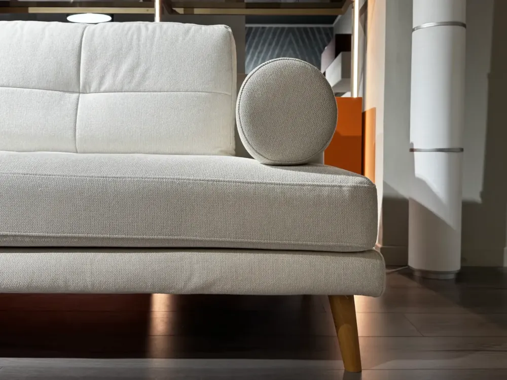 Divano Nixon di Samoa 3 posti in tessuto Loft Cat completamente sfoderabile con bracciolo cilindrico, cuscini schienale in piuma d oca sterilizzata e fibra di poliestere suddivisi in comparti. Piede Log in legno colore naturale.