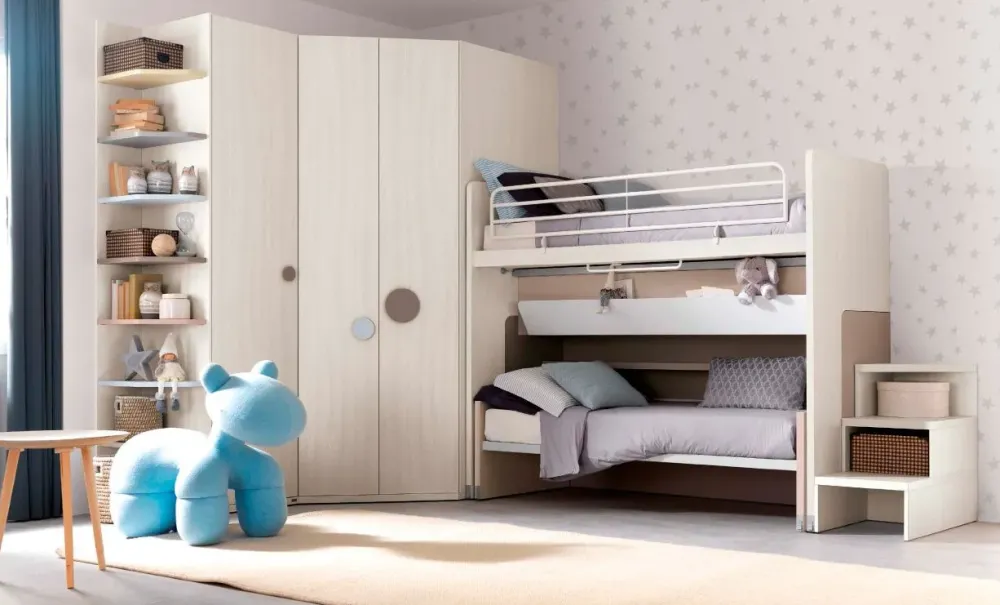 - Lo spazio junior deve essere arredato in modo da assicurare una serena quotidianità ai più giovani, in uno spazio molto ampio che dia loro la completa libertà di divertirsi e rilassarsi sempre seguendo le loro passioni: il brand propone una scelta quasi infinita di tipologie di camerette per le più diverse esigenze, da quelle a terra a quelle salvaspazio, da quelle per bebè a quelle per teenager; il modello Quik a020qui visibile fa parte della linea di camerette con letti a castello.