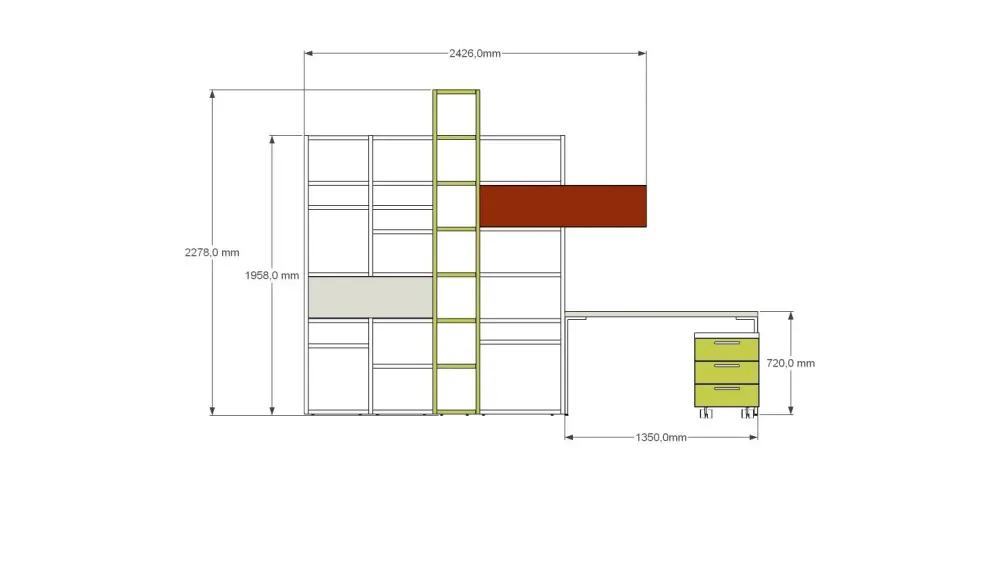 Composizione libreria con scrittoio e cassettiera 4 cassetti. Adatta come completamento di una camera ragazz* o come allestimento per una zona studio o smart working.