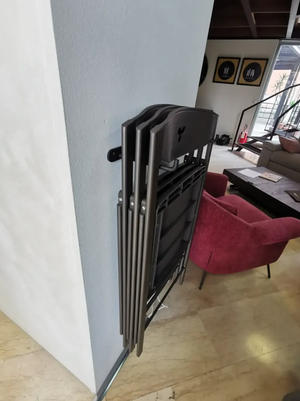 Le composizioni arredative che rivendiamo, tra cui questa con sedia Pieghevole Easyline, sono sempre costruite con materie prime di qualità, perciò pure in metallo in una o più tonalità di colore; questa soluzione in metallo resisterà nel tempo mixando praticità e design.