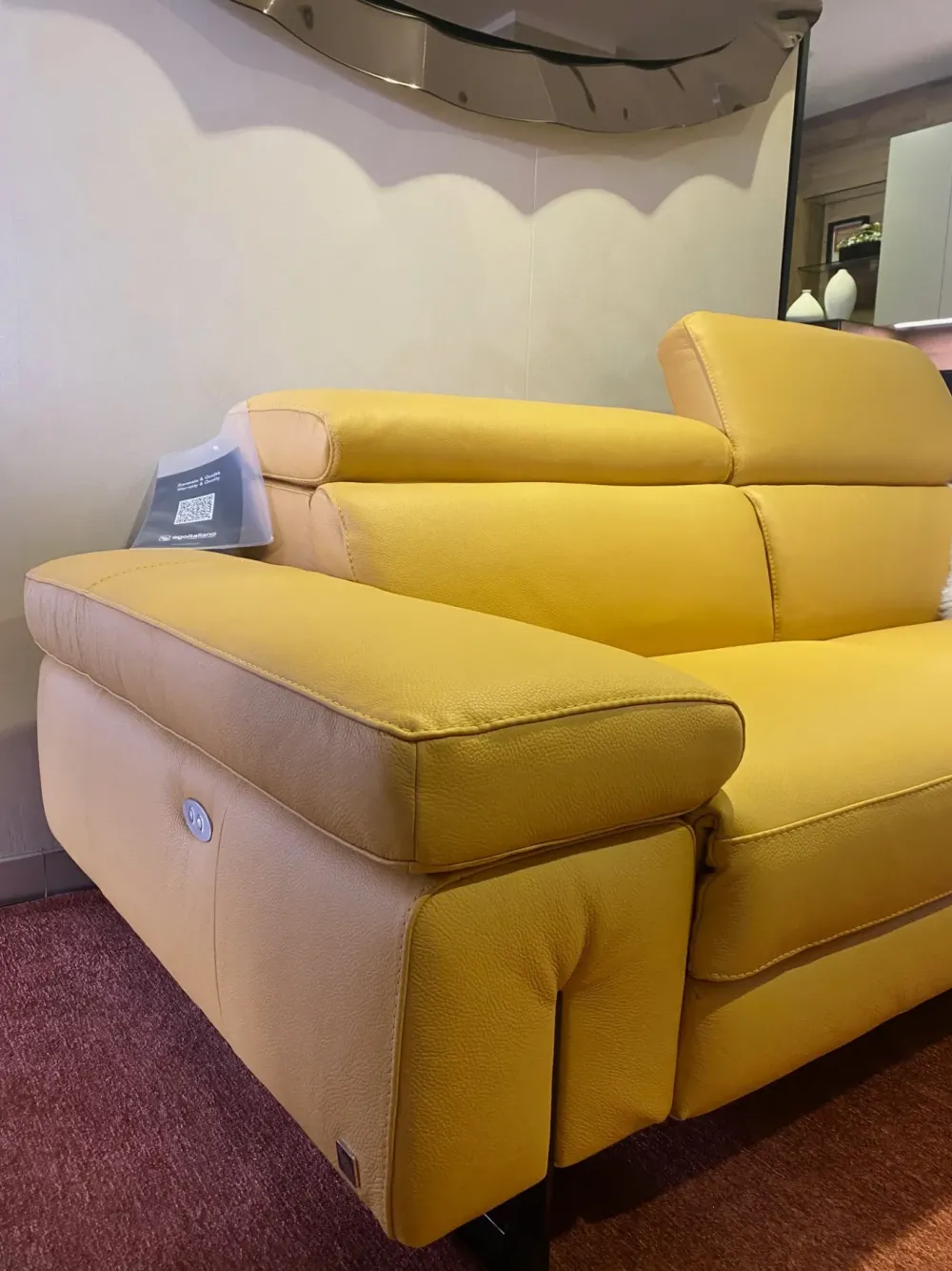 Il divano candice molto bello ed elegante, in vera pelle si adatta benissimo ad ogni ambiente. I due recliner elettrici sono molto funzionali e sono molto apprezzati da coloro che hanno bisogno di rilassarsi. Il divano è lungo 222cm. Lo schienale possiede un pratico cricchetto che si alza e si abbassa a seconda delle esigenze. Colore pelle bull giallo. in omaggio il kit di pulitura pelle.