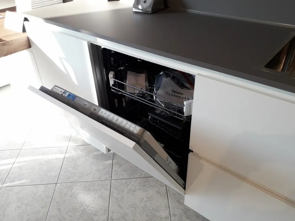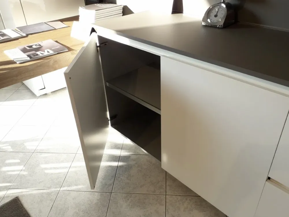 Composizione cucina con penisola scontata Ernestomeda mod. ONE80, versione FENIX Bianco Kos e Grigio Londra, con top e alzata in Fenix Grigio Londra, con vani a giorno e penisola Balance in laminato materico effetto legno tinta Brandy, con gole e zoccolo h 7 cm in finitura bianca. Dimensione: parete attrezzata lunghezza totale 390 cm, parete colonne lunghezza totale 187 cm. La composizione è completa dei seguenti elementi: penisola Balance dimensione 180 x 90 cm, base sotto la penisola da 60 cm con anta battente, base da 60 cm con anta battente, anta per lavastoviglie a scomparsa da 60 cm, base sottolavello a due cestoni da 90 cm completa di set pattumiera per raccolta differenziata, base sotto il piano cottura a due cestoni ed un cassetto interno fornito di portaposate Wengè, colonna dispensa con ripiani estraibili, colonna forno da 60 cm con un’anta, due cassetti ed un cestone, colonna frigocongelatore da 60 cm, doppia gola verticale per colonna da 3,5 cm, pensile AllInOne con illuminazione Led lunghezza 210 cm diviso internamente (vano dispensa, vano scolapiatti e vano cappa) e pensili a giorno H 18 cm. La cucina è fornita inoltre dei seguenti elettrodomestici: lavello inox con incasso semifilo serie S4001, miscelatore cromato Barazza mod. B_Free, lavastoviglie a scomparsa totale Electrolux mod. TT803R3, piano cottura ad induzione da 60 cm Electrolux mod. KTI6500E, forno inox Electrolux mod. FQ63X e frigocongelatore Electrolux mod. ENN2851AOW. Tavolo e sedie escluse, possibilità di acquisto su richiesta con prezzo da concordare in aggiunta. VENDITA PER RINNOVO ESPOSIZIONE. TRASPORTO E MONTAGGIO ESCLUSI.