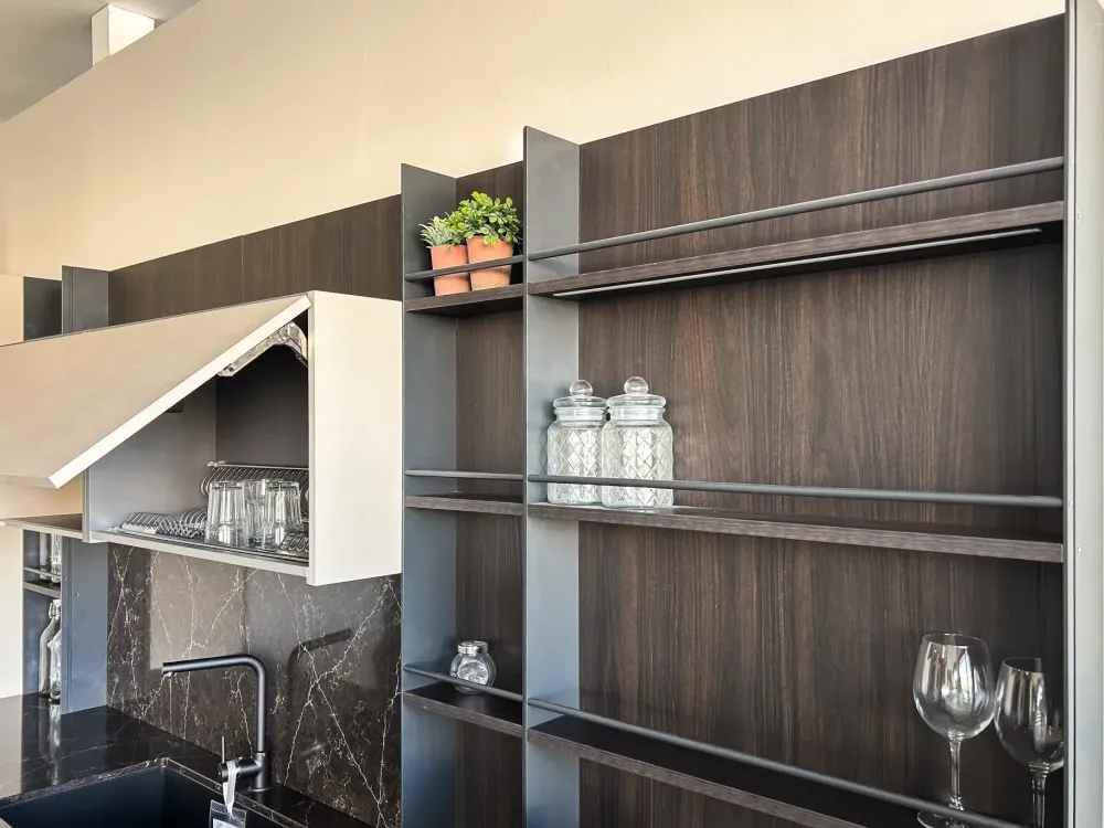 Questa cucina moderna ed elegante combina linee pulite e materiali raffinati, come il top in marmo e gli armadi dal design minimalista. Perfetta per chi cerca funzionalità e stile, offre ampi spazi di archiviazione e un ambiente luminoso e accogliente.
