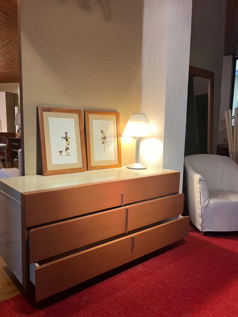 Cassettone a tre cassetti in teak con top in vetro retro laccato color nuvola . Finitura cassetti a 45 gradi . Misura cm 150 x 55 x 70 di altezza ,