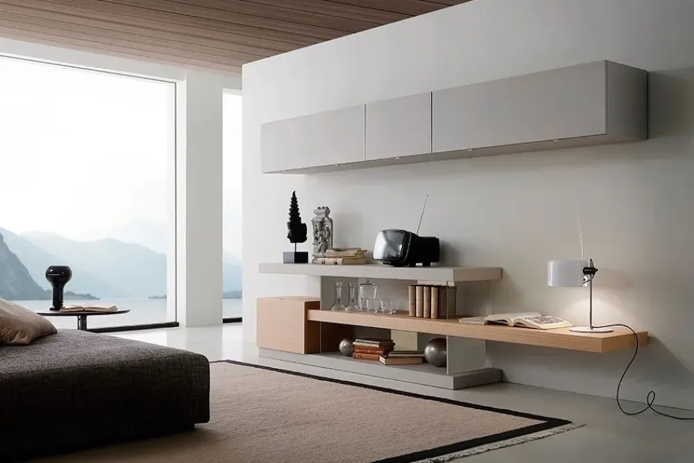 Per arricchire un soggiorno design scegli una parete attrezzata che mantenga una certa idea di stile, come questo modello F2/ zi line con pensili a prezzo ribassato.