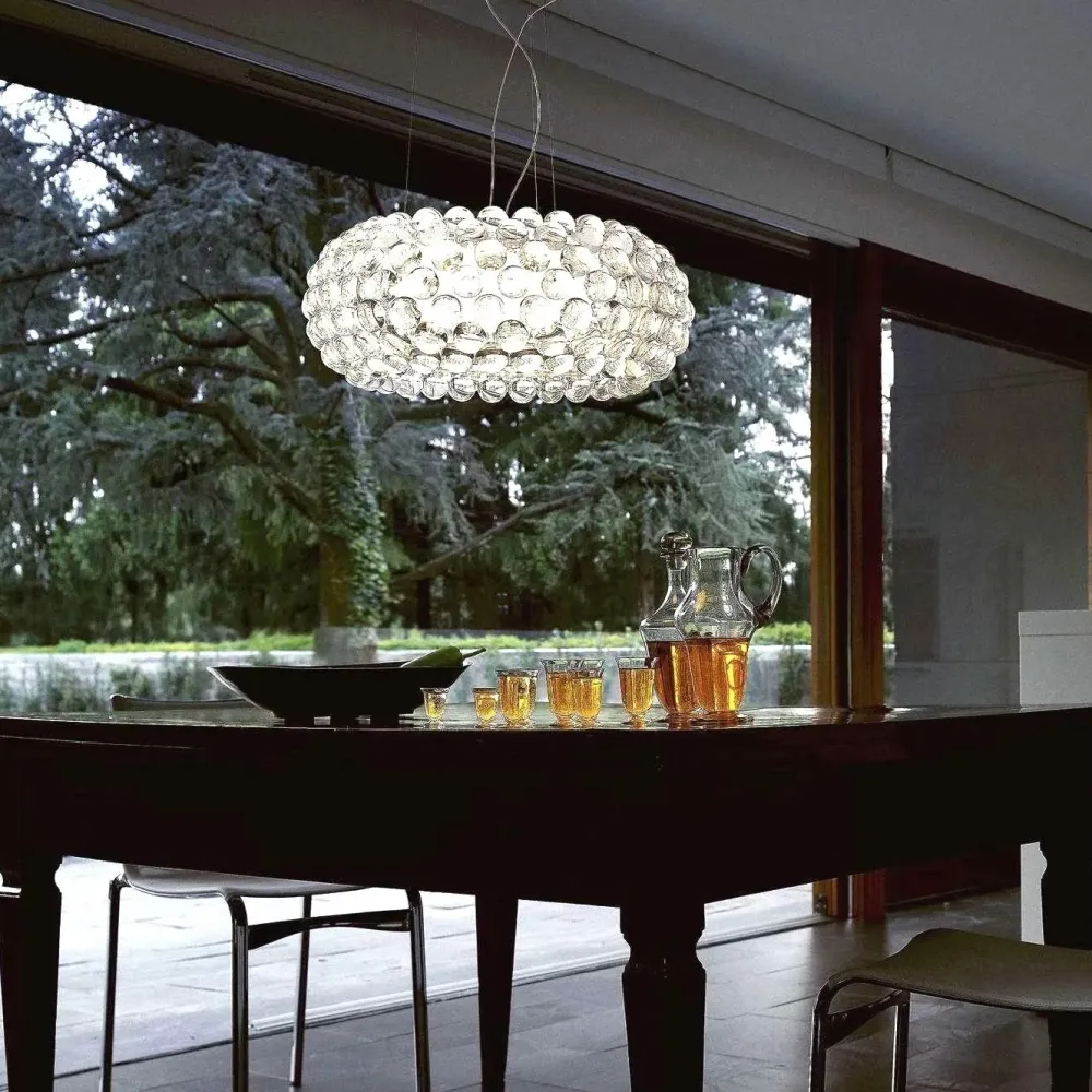 Caboche diffonde la luce nell’ambiente a 360° e in modo omogeneo, attraverso le numerose sfere di polimetilmetacrilato di cui è composta che celano la lampadina e al tempo stesso rendono la lampada sfavillante e leggera.