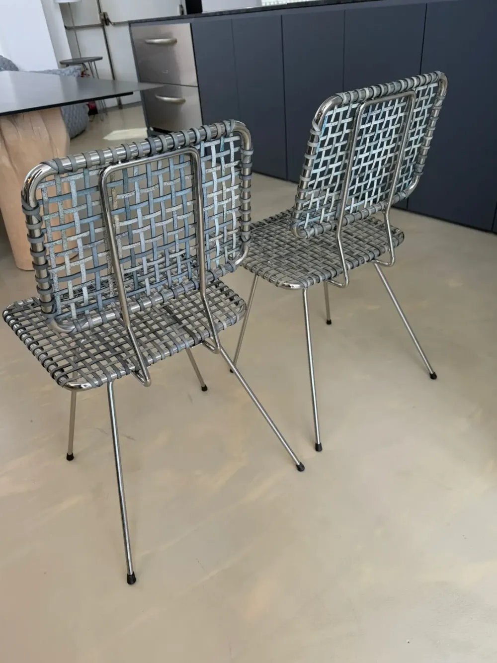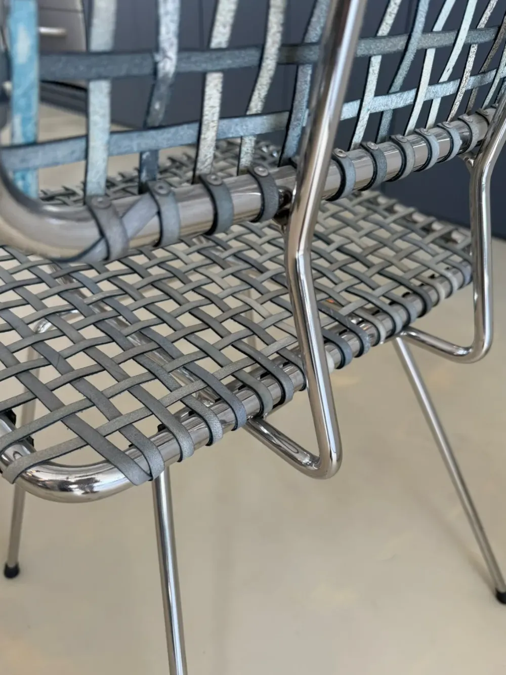 - Materiale: Sedia con struttura in acciaio cromato, seduta e schienale intrecciati in pergamena tinta grigio.