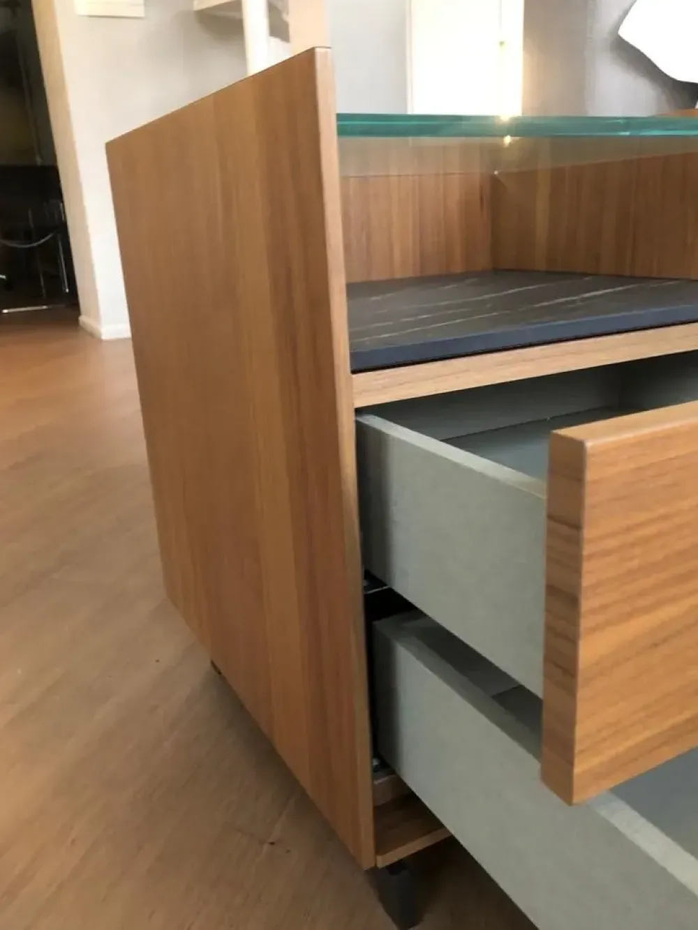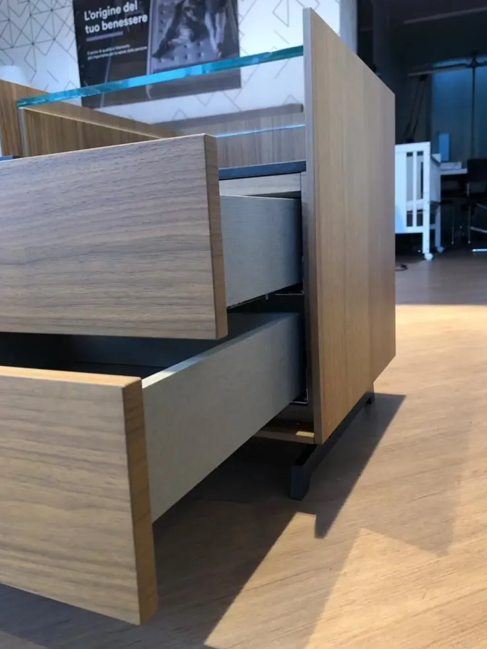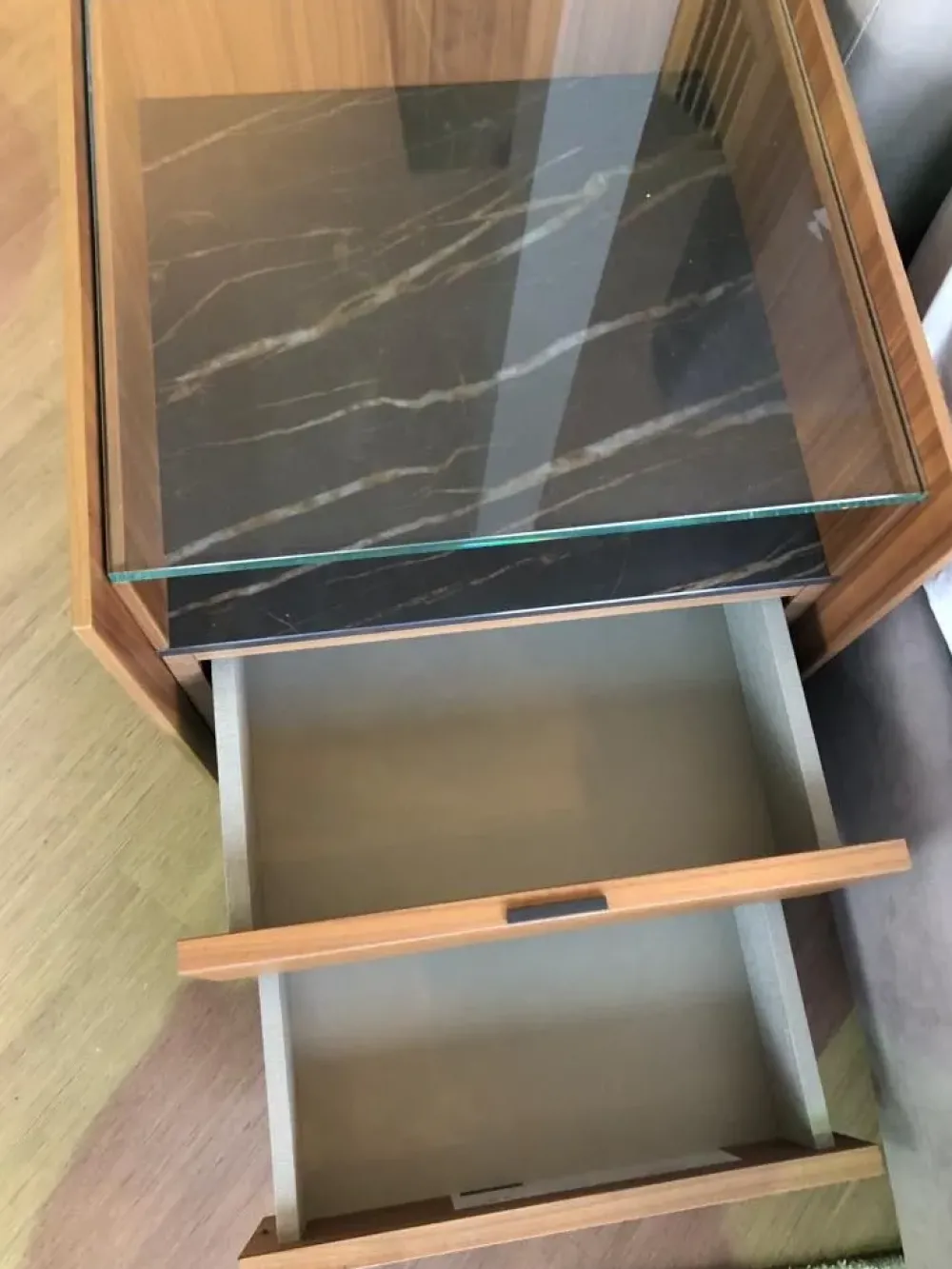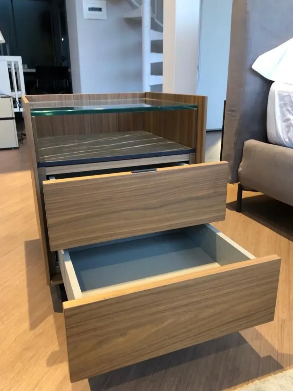 In questo caso, il top è realizzato in ceramica effetto marmo Noir Desir opaco con il piano in vetro che fa da lente per la sua matericità, sottolineando la preziosa leggerezza dell’insieme. La parte inferiore è, invece, dotata di due ampi cassetti ad estrazione totale, con frontale di spessore 2cm: il primo con sistema di chiusura rallentato e maniglia Minimal finitura metallo Brown, il secondo con meccanismo push-pull. Il comodino presenta la parte perimetrale e i cassetti in impiallacciato Noce Canaletto, l’appoggio a terra viene garantito dal basamento sospeso sagomato con piedini in metallo finitura Brown.