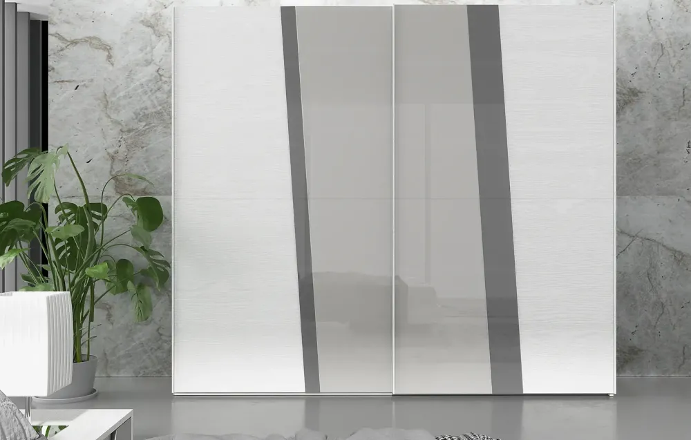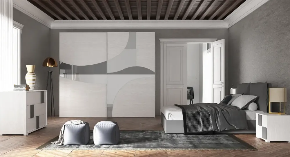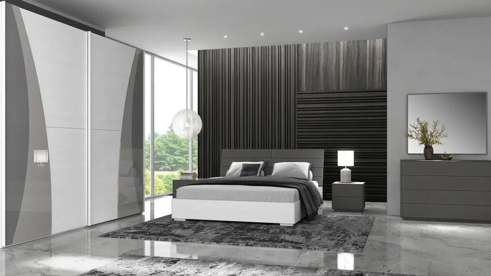 camera matrimoniale completa di armadio 2 ante maxi scorrevole ante in vetro misura cm.L.270xP.59 x H. 244 , 1 Comò 4 cassetti chiusura rallentata misura cm. L.1200xP.51XH.86, 2Comodini con 2 cassetti, misura: cm. L.52XP.41XH.49 , Letto matrimonilale Vogue von contenitore, misura : cm. L. 176XP204XH.110, Specchiera V misura cm. L.105xP2,1xH.85 Il comò ed i comodini sono in tinta grigio scuro , la testiera letto in grigio scuro , il contenitore in bianco frassino. l’armadio struttura in grigio scuro ante in vetro colorato. armadio Battente realizzato in nobilitato frassino gesso sp.18 mm., frontali realizzati in nobilitato frassino gesso e grigio scuro sp.18 mm, fianchi esterni realizzati con lavorazione soft, chiusura ante con cerniere ammortizzate, piedini livellatori regolabili. Possibilità di scegliere 2 tipologie di maniglie in 2 finiture. Armadio scorrevole Struttura e frontali realizzati in nobilitato fressino gesso. Frontali rifiniti con maniglioni rivestiti stesso decorativo della cassa. Frontali con doppia regolazione interna per anti imbarcamento . Fianchi e ripiani realizzati in nobilitato sp.25mm, frontali , cielo,fondo e tramezzi realizzati in nobilitato sp.18mm . Sistema di scorrimento con carrekki ammortizzati. Possibilità di scegliere 7 tipologie di frontali. colori del vetro: vetro grigio scuro, vetro grigio chiaro , specchio argento.