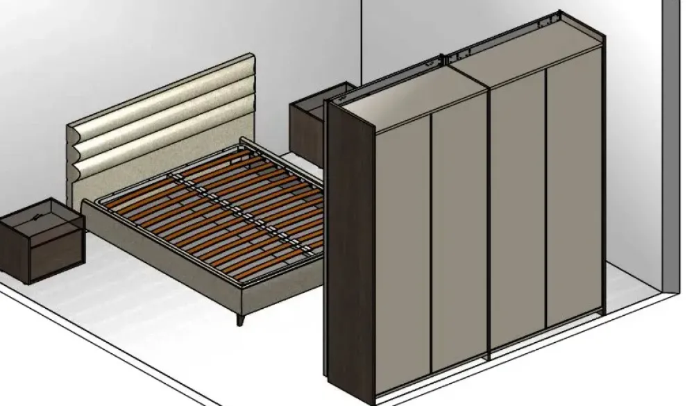 Camera completa di armadio con ante scorrevoli e letto con imbottito con contenitore e rete , in aggiunta gruppo camera composto da comodini con cassetti ammortizzati e spazioso como’ per arredare tutta la tua stanza.