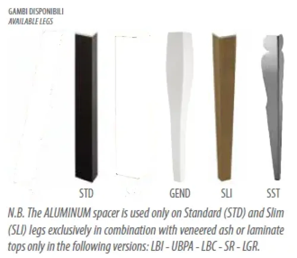facilitato; piano e allunghe disponibili in laminato, impiallacciato frassino, rovere nodato o rovere spaccato; gambi in legno o