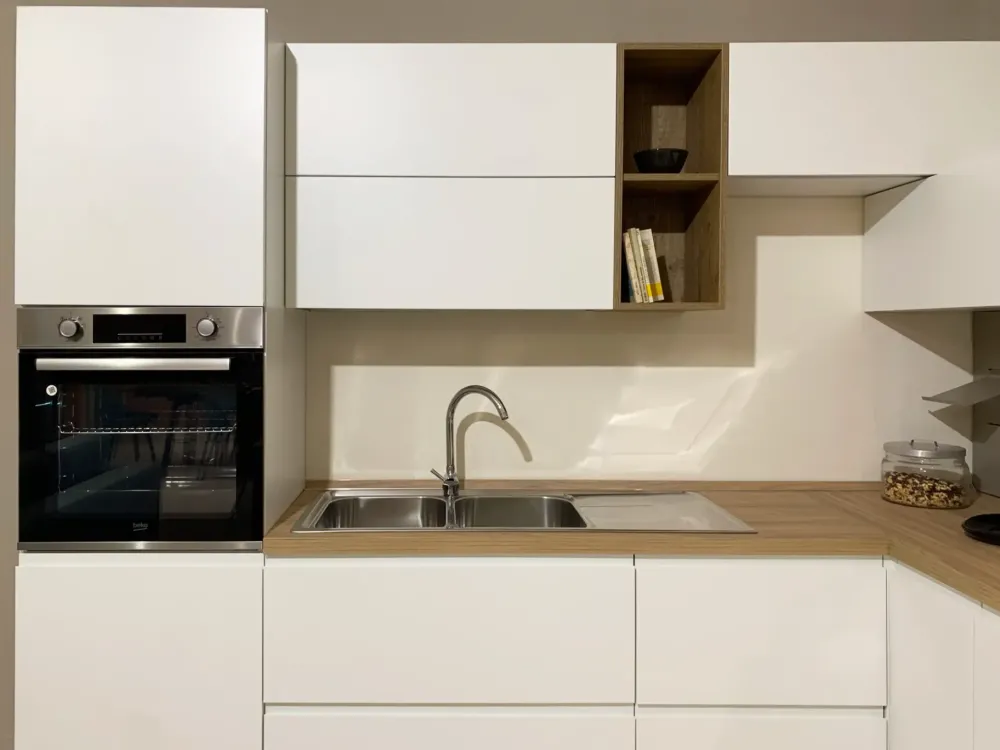 Cucina angolare con anta fresata laccato opaco bianco neve, alta qualità di materiali. Completa di elettrodomestici marcati beko: Frigocongelatore con caratteristica MinFrost® classe A, lavastoviglie 13 coperti e 5 programmi classe A, Forno elettrico 8 funzioni classe A. Cappa incassata Elica, lavello inox 2 vasche con scivolo e miscelatore.