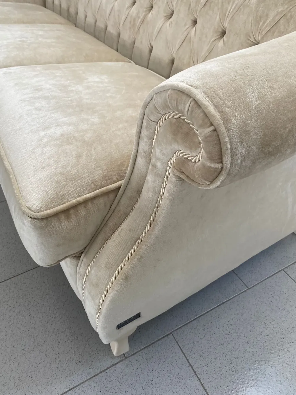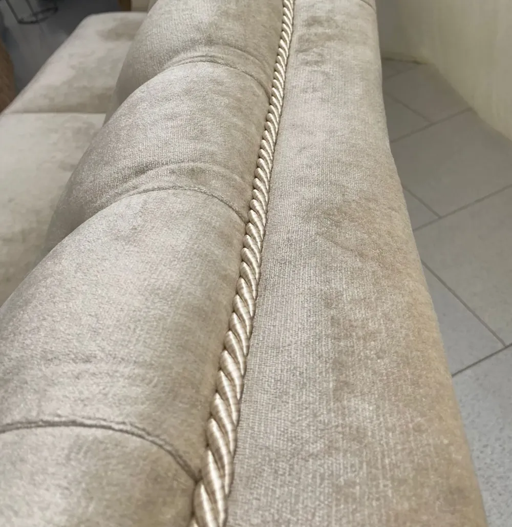 Struttura in legno di rovere e cinghie elastiche incrociate ad alta resistenza. Imbottitura cuscini di seduta in poliuretano espanso ad alta densità e waterlily indeformabile con materie prime ecologiche a base di acqua. Seduta brevettata per un sostegno ottimale. Perimetralmente allo schienale capitonné e nei braccioli è intarsiata una corda viva bagnata nella colorazione del velluto. Rivestimento in velluto colore panna, idrorepellente.