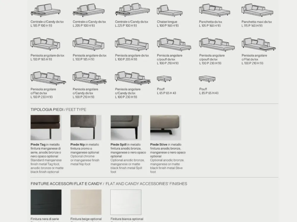 - Piedi di serie modello TAG di serie H.18cm. VEDI SCHEDA TECNICA.