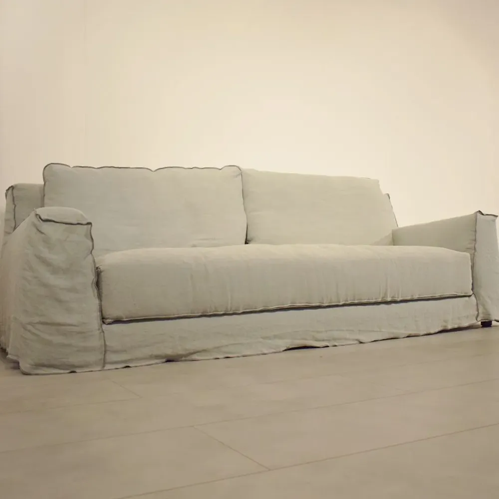 Divano, struttura in legno massello rivestita in poliuretano espanso a quote differenziate, localizzate, ad alta densità. Tessuto cat. C Linen-Concrete. Cuscini di seduta in piuma d oca canalizzata con inserto centrale in poliuretano espanso a quote differenziate ad alta resilienza e molle insacchettate. Dimensioni l. 240 p. 105 h. 78.