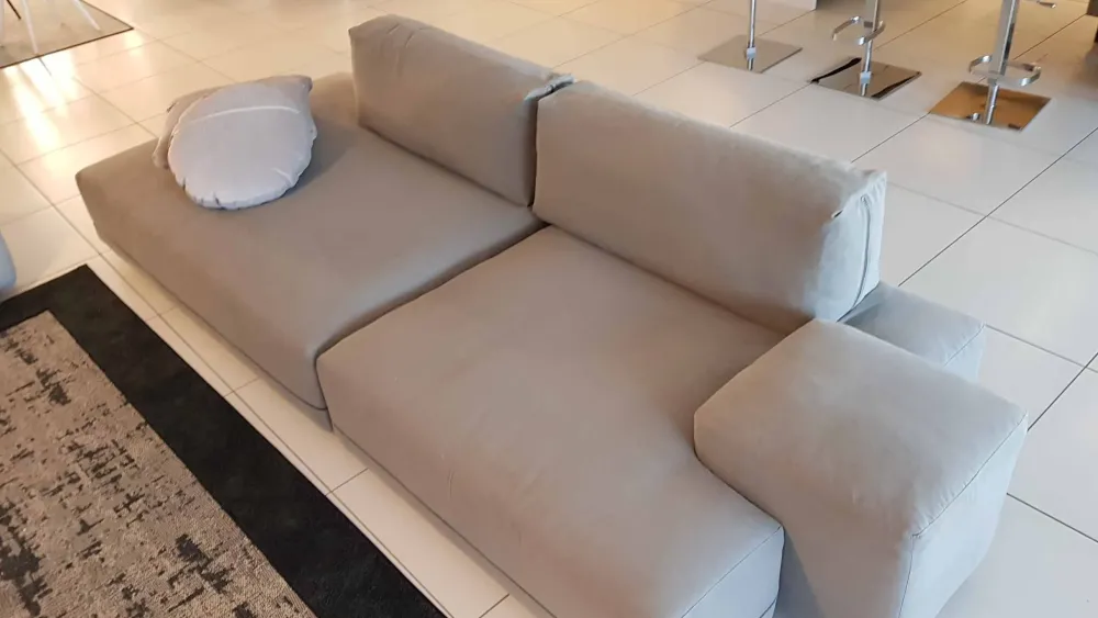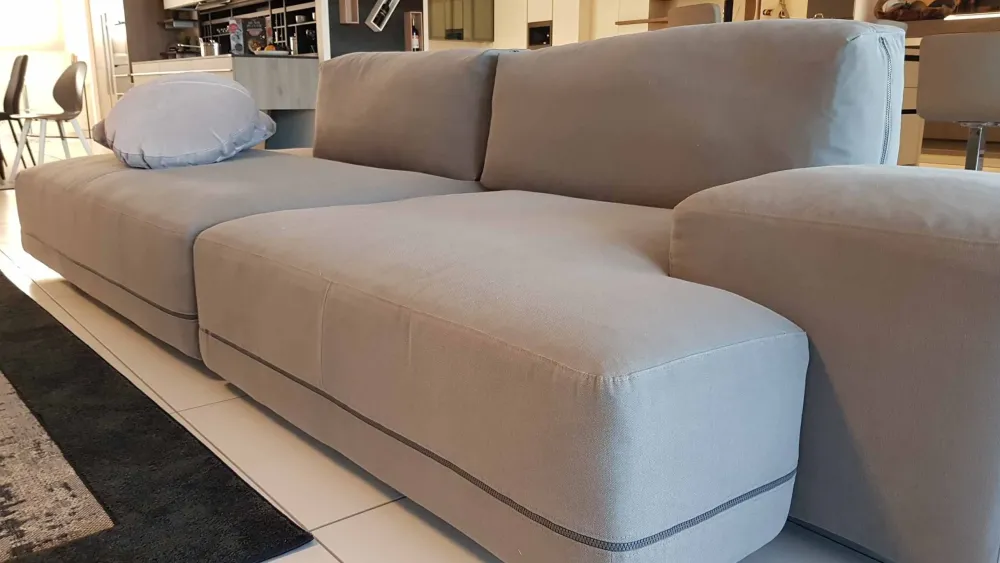 Il rivestimento è in tessuto sfoderabile e lavabile, la particolare cerniera in evidenza sulle sedute è in colore grigio e conferisce carattere al divano consentendo di personalizzarlo cambiando il colore ed il materiale delle due sezioni.