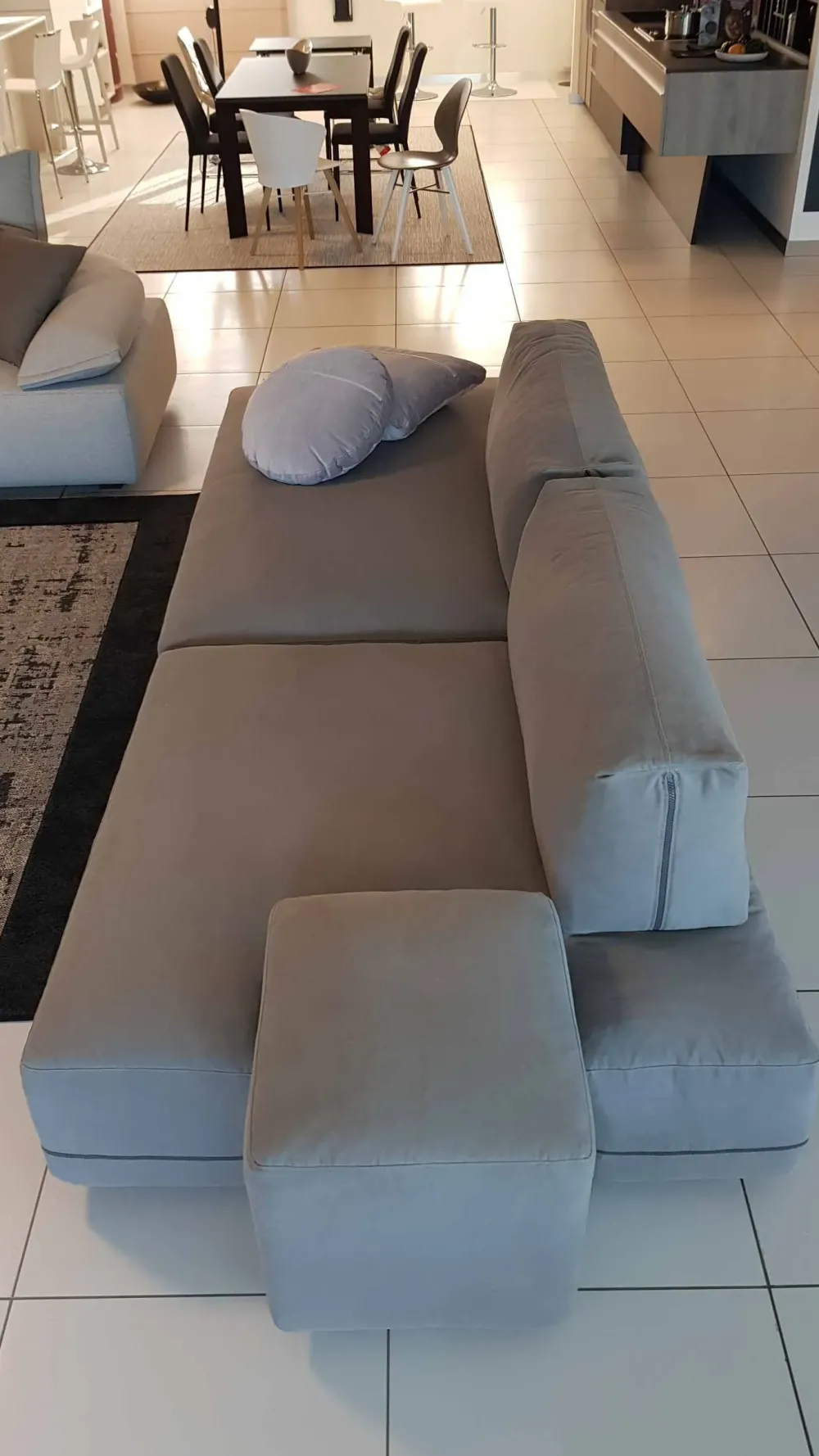Le sedute sono dei grossi pouff spostabili e girevoli che possono essere configurati a piacimento per ottenere una composizione angolare, lineare, con penisola oppure un’unica e grande isola grazie alle dimensioni generose degli stessi.