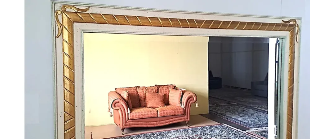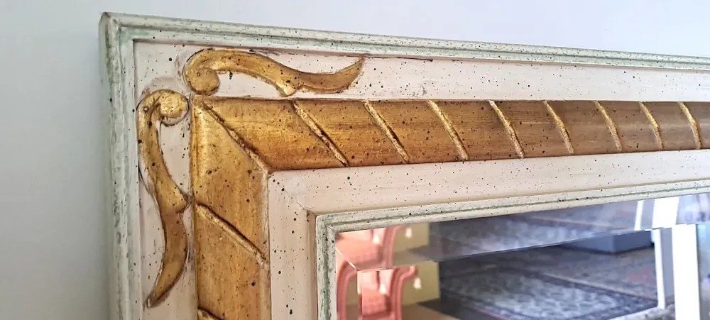 Specchiera con cornice patinata avorio e particolari oro, lavorazione specchio bisellato.