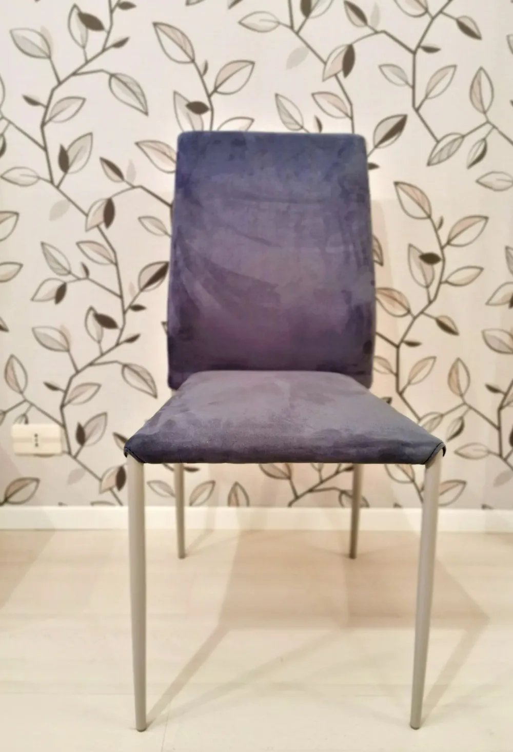 Sedia con struttura in Acciaio laccato grigio chiaro, seduta e schienale imbottiti e rivestiti in Pelle Eco Nabuk blu. Dimensioni (in cm): 44x56x92/47