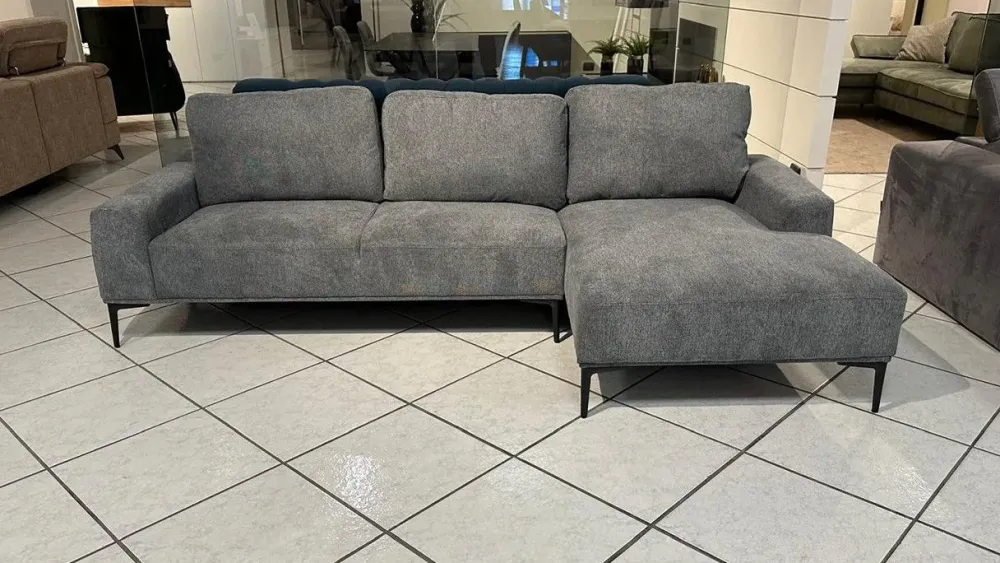 Divano modello Iseo in tessuto grigio con penisola e piedini a spillo neri. In promozione all’interno dello Store di Cerignola (FG) a: 580,00