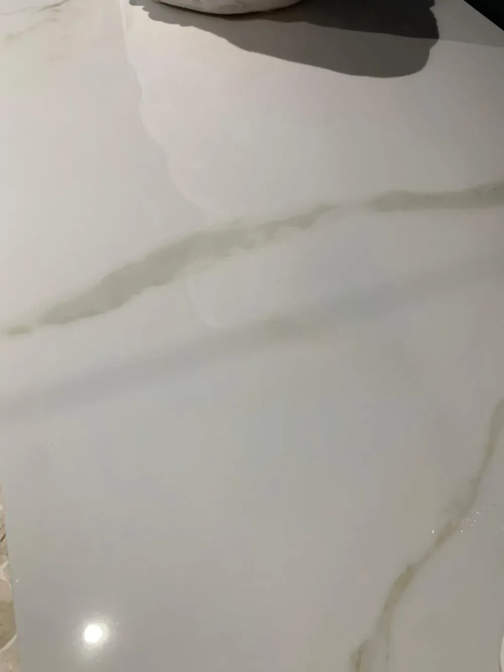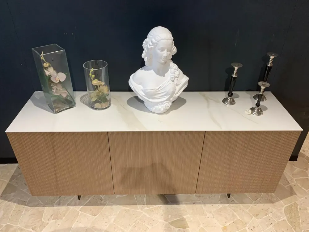 Madia con top in ceramica calacatta oro, ante in cannettato verticale.