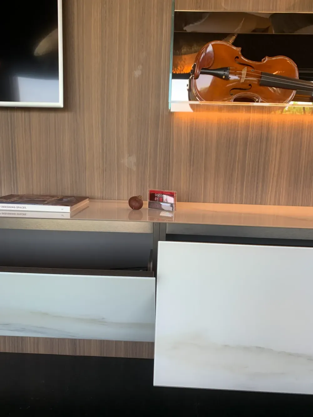 - Elemento principale Materia Tv Unit 1048 in XGlass Lucido finitura Calacatta Gold, con un elegante gioco di volumi: ribalta da 184 cm e cestone da 110,4 cm – dimensioni cm L. 295,2 x P. 40,6 x H. 37,2