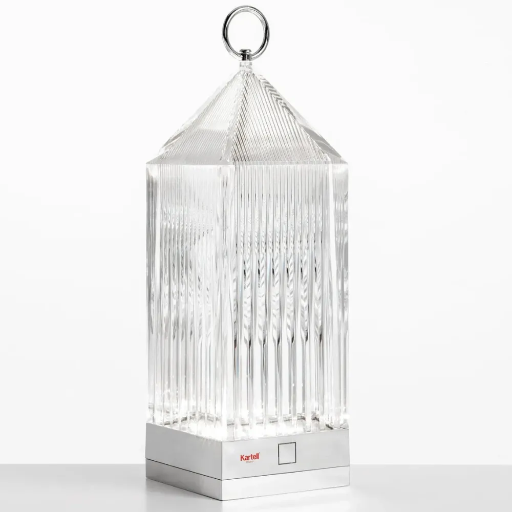 Disponibile in versione Cristallo o Fumè. Lantern è un originale lampada a led portatile, una lanterna ricaricabile trasparente, stampata a iniezione, che si ricarica appoggiandosi a una base conduttrice. La luce viene proiettata grazie a un effetto grafico del design.