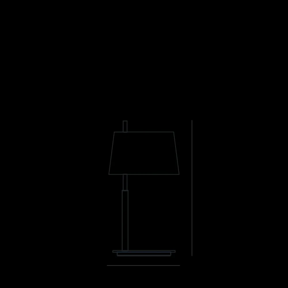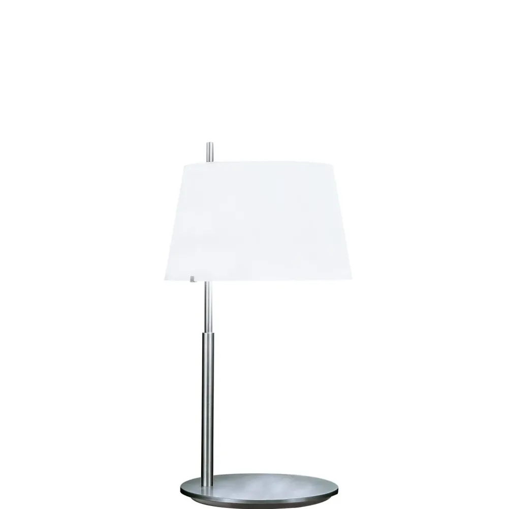 Lampada da tavolo a luce diffusa dimmerabile. Montatura e riflettore superiore in metallo nichelato spazzolato. Diffusore in vetro soffiato satinato. Cavo di alimentazione, dimmer e spina trasparenti. Spina europea due poli. Fonte luminosa non inclusa.
