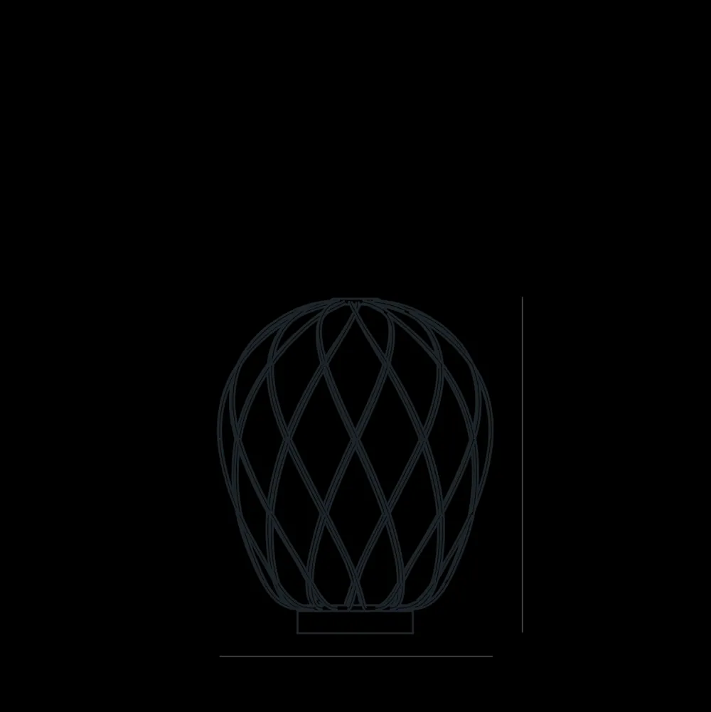 Lampada da tavolo a luce diffusa dimmerabile. Diffusore in vetro soffiato acidato ingabbiato. Gabbia e base in metallo galvanizzato. Cavo di alimentazione, dimmer e spina trasparenti. Spina europea due poli. Fonte luminosa non inclusa.