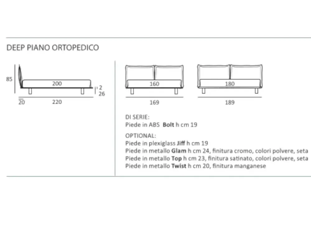 - Il prezzo esposto è relativo alla versione matrimoniale con piano ortopedico in multistratto per materasso 160×200, e con rivestimenti a scelta in categoria A, piedi di serie Bolt.