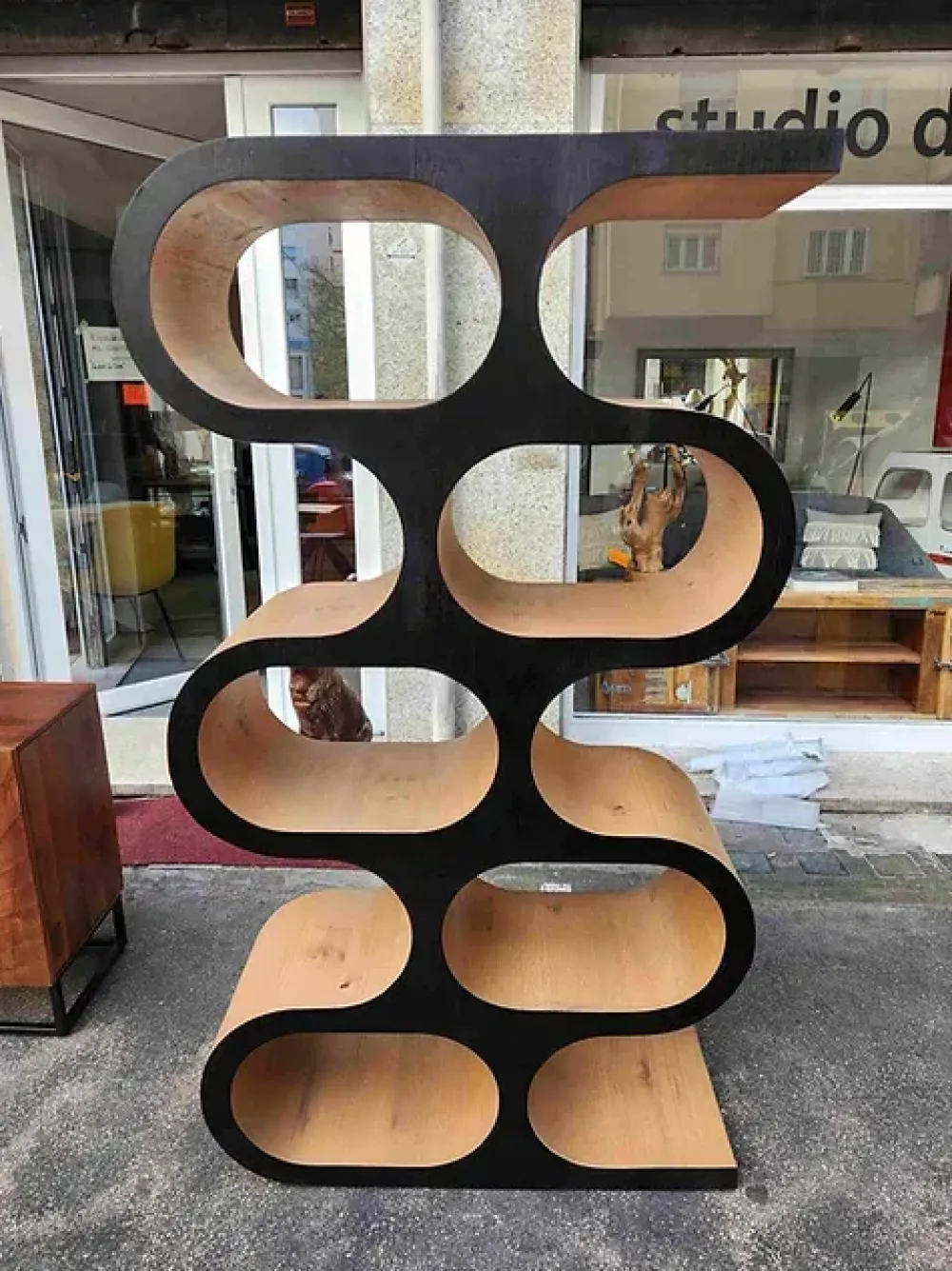 Originalissima libreria dal design etnico, con linee curve e arrotondate. Questo mobile si adatta bene ad ambienti etnici, industrial ma può essere utilizzato anche in contesti moderni, per creare contrasto o aggiungere un tocco di calore naturale.